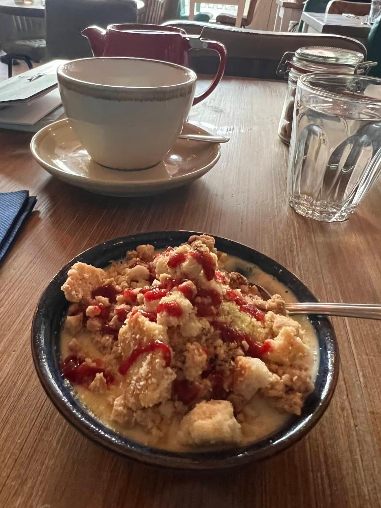 Set vanilla cream, rhubarb compote & jelly, shortbread biscuit crumb.