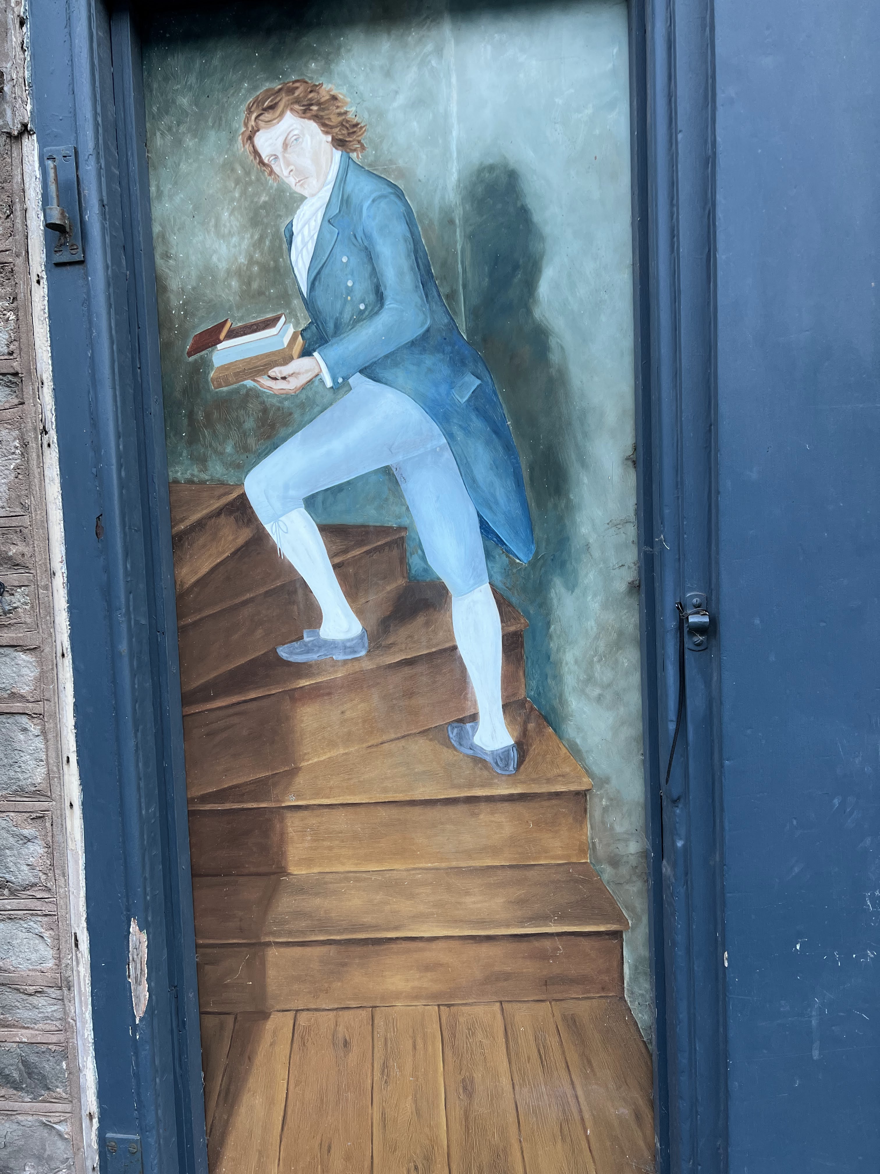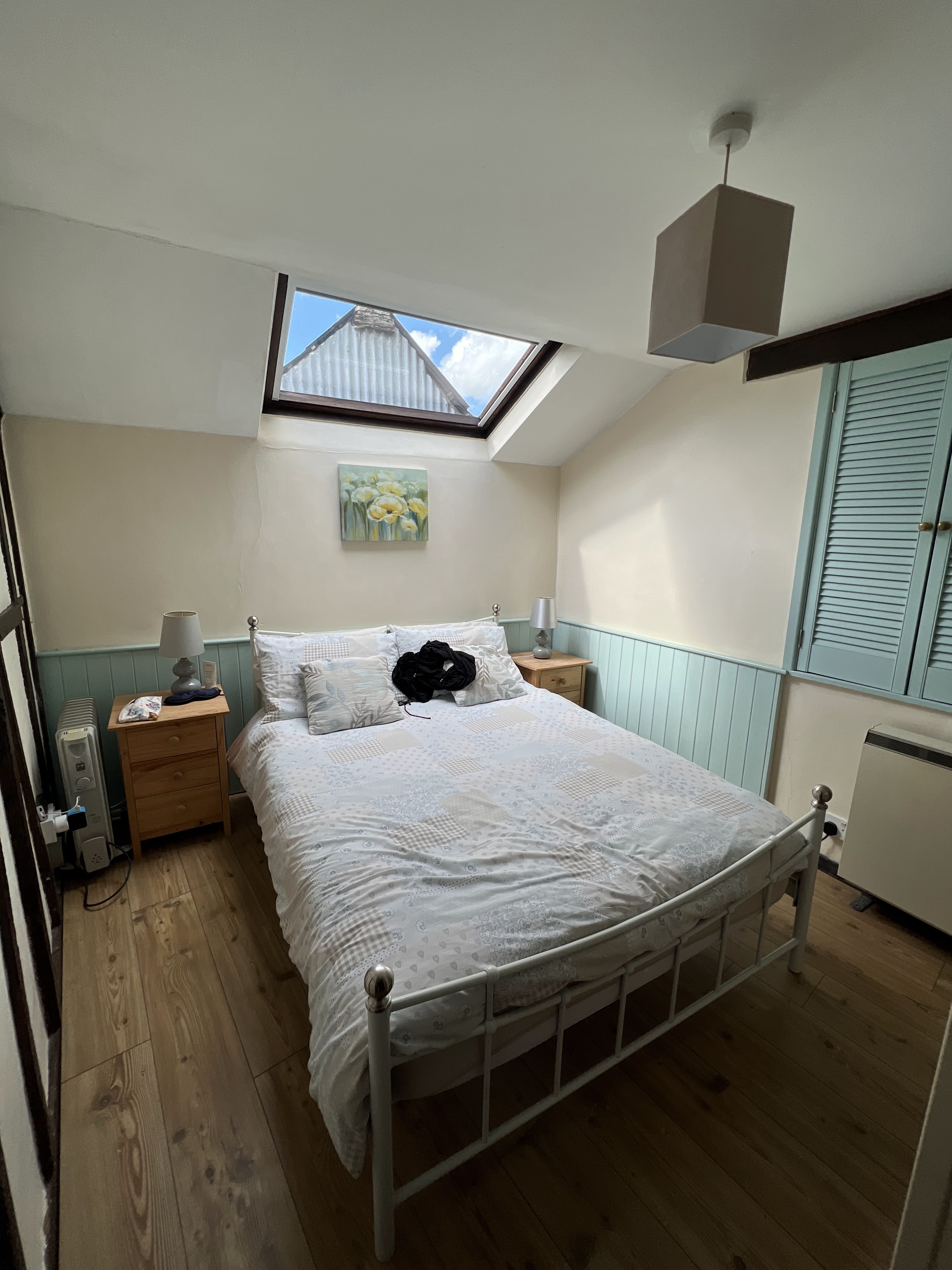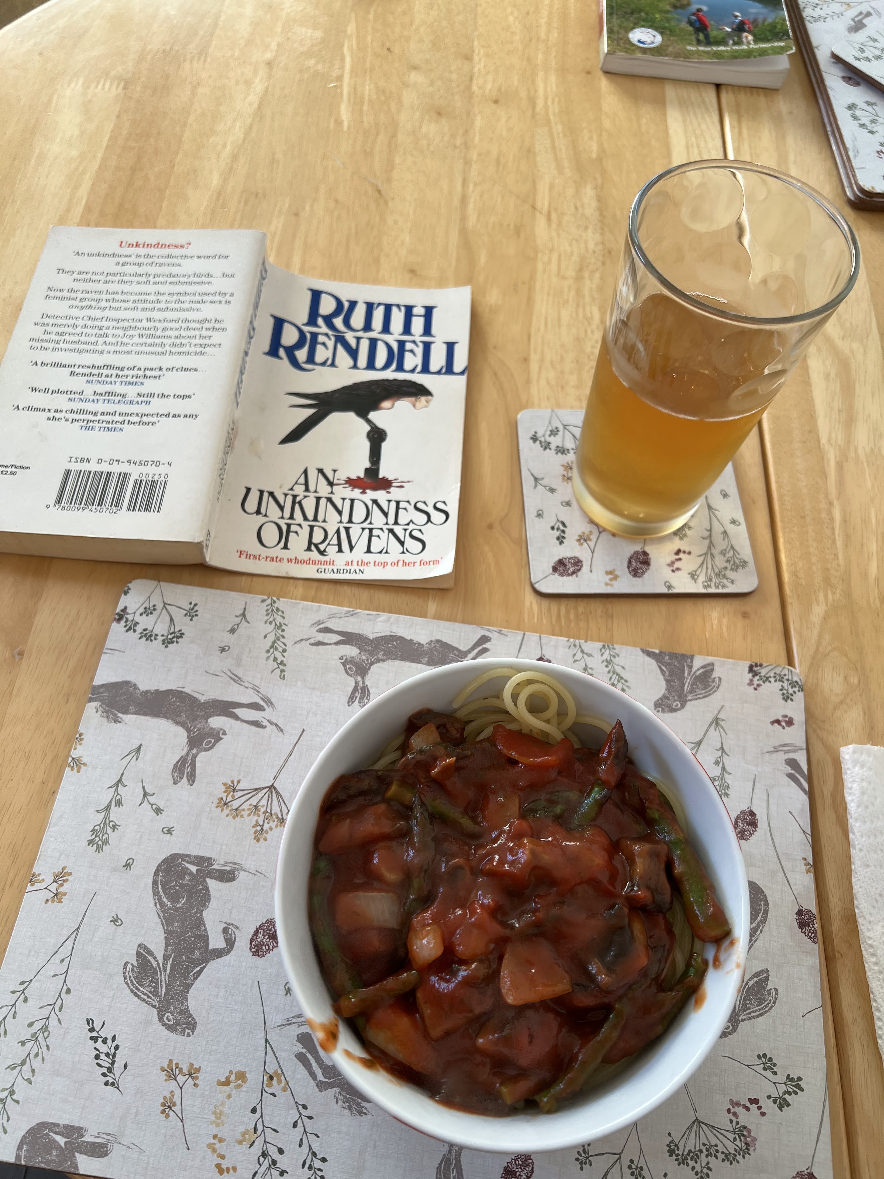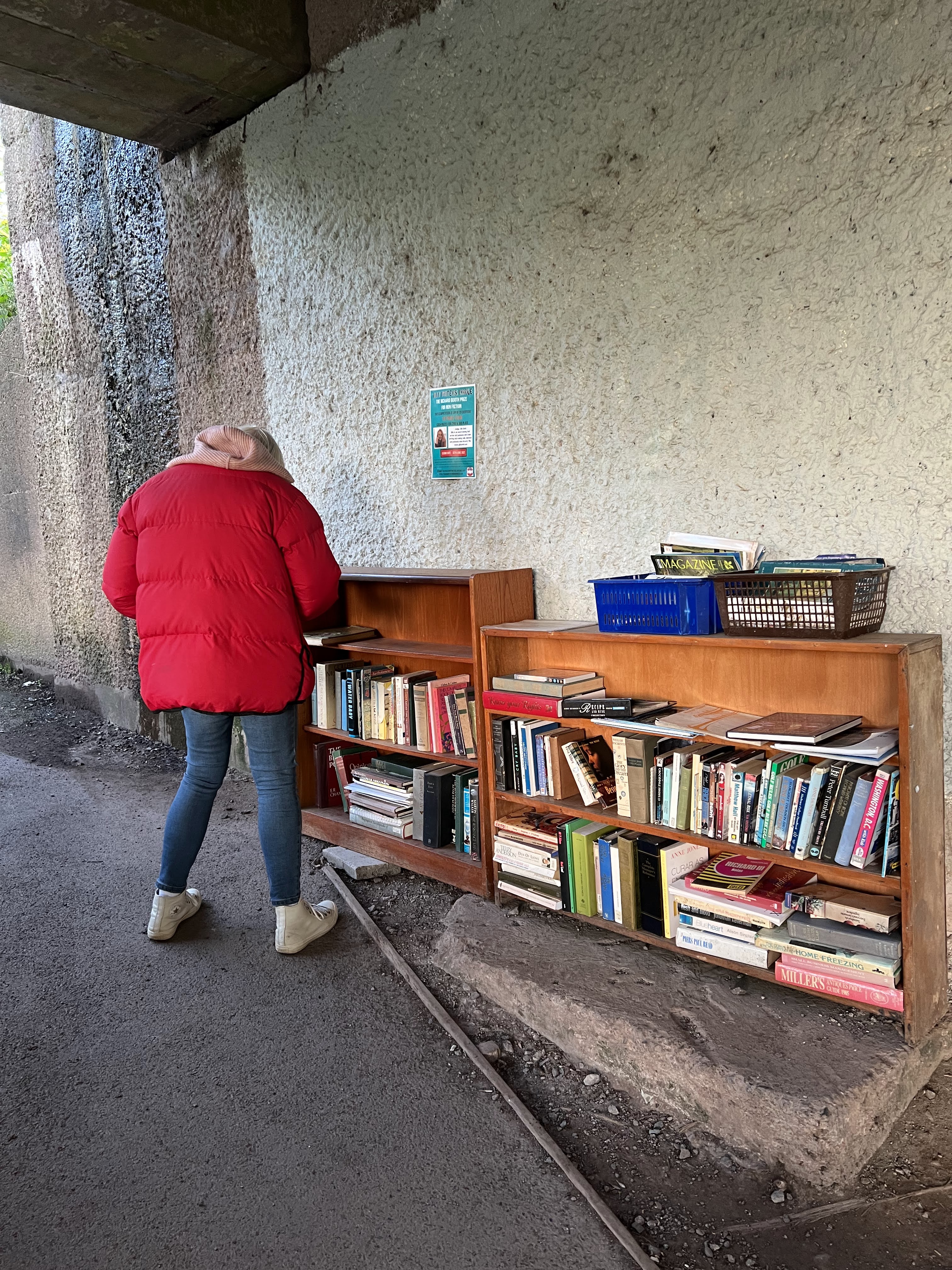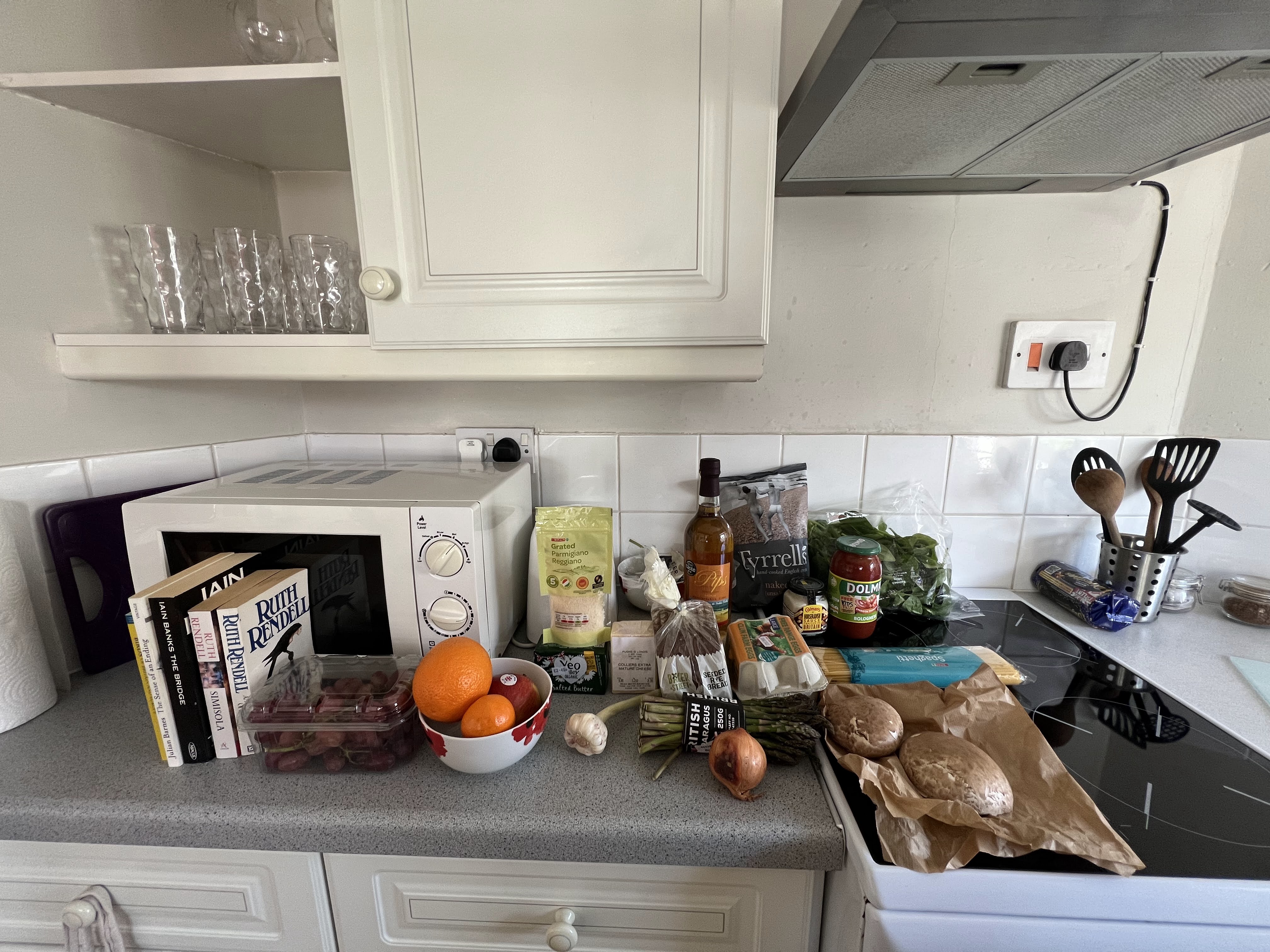 This Bakelite collection drove me crazy!Want. All. Of. These.and thisand these, please.Took this photo for my honey. From a collection of school posters from the 1960’s.Grocery shopping on my way home. Here’s my booty for the day!I was SO HAPPY to be able to cook for myself. First time since I arrived in the UK two weeks prior. Spaghetti, veg, and a tasty cider with my Ruth Rendell.A little post-dinner walk to the river.OMG an honesty bookshop under a bridge!A lovely evening. Hello, moon.A mural along the street. This shop was closed, but I was keen to return the next day!My little bedroom, with skylight.I really loved this kitchen!Tiny but perfect bathroom.As the dusk duskened, a cup of tea and McVities dark chocolate biscuits. So happy to be in Hay!
