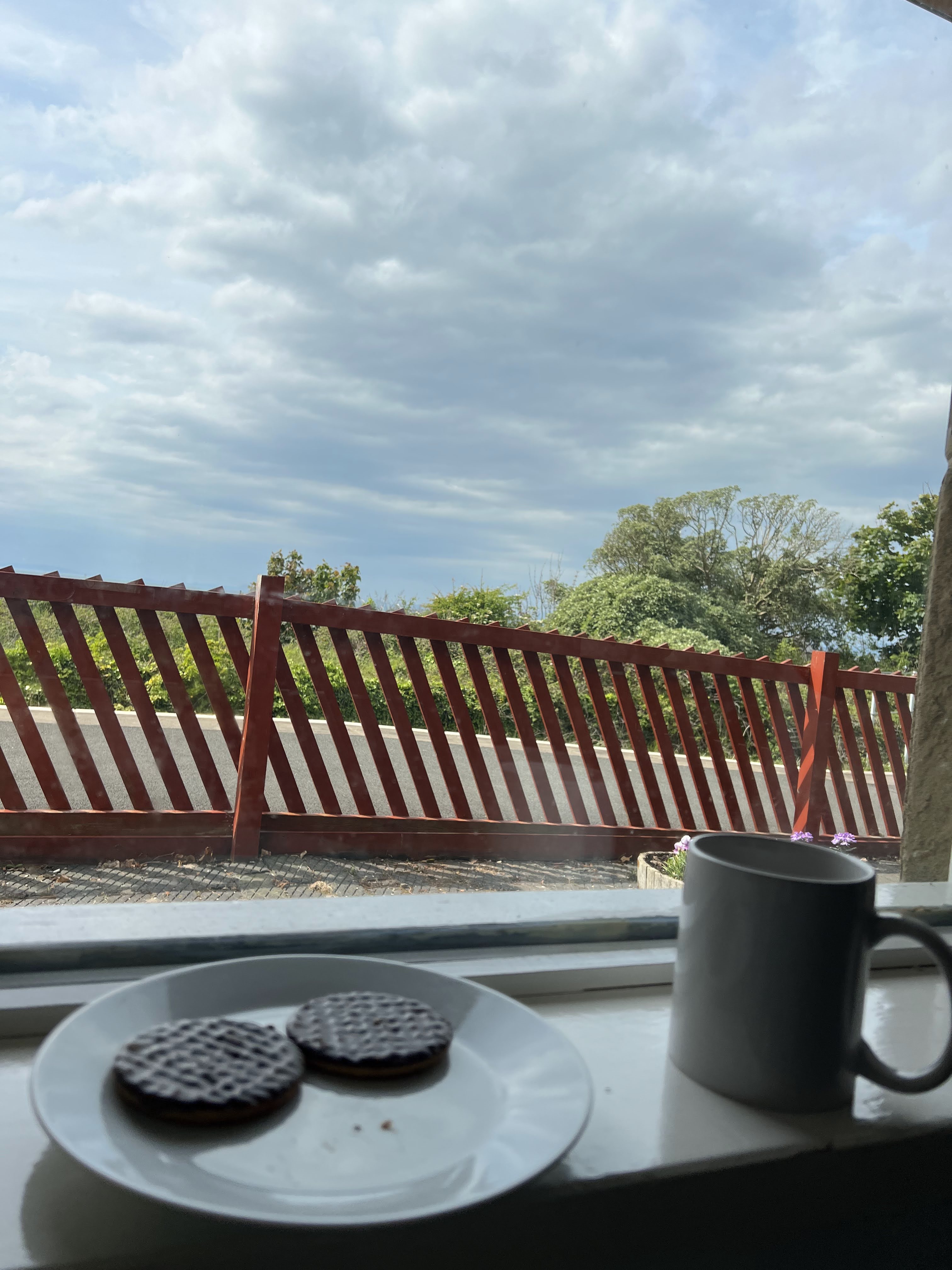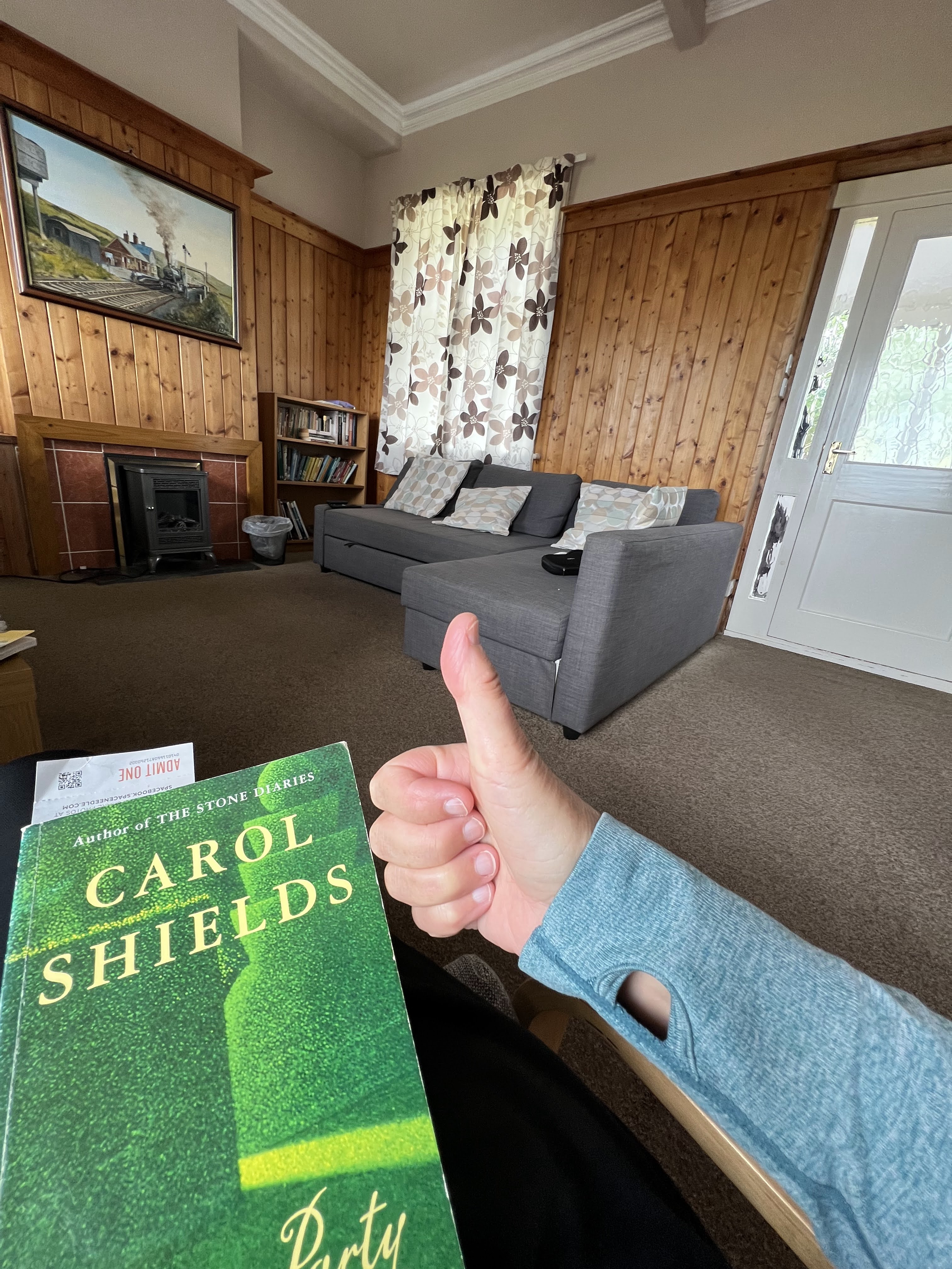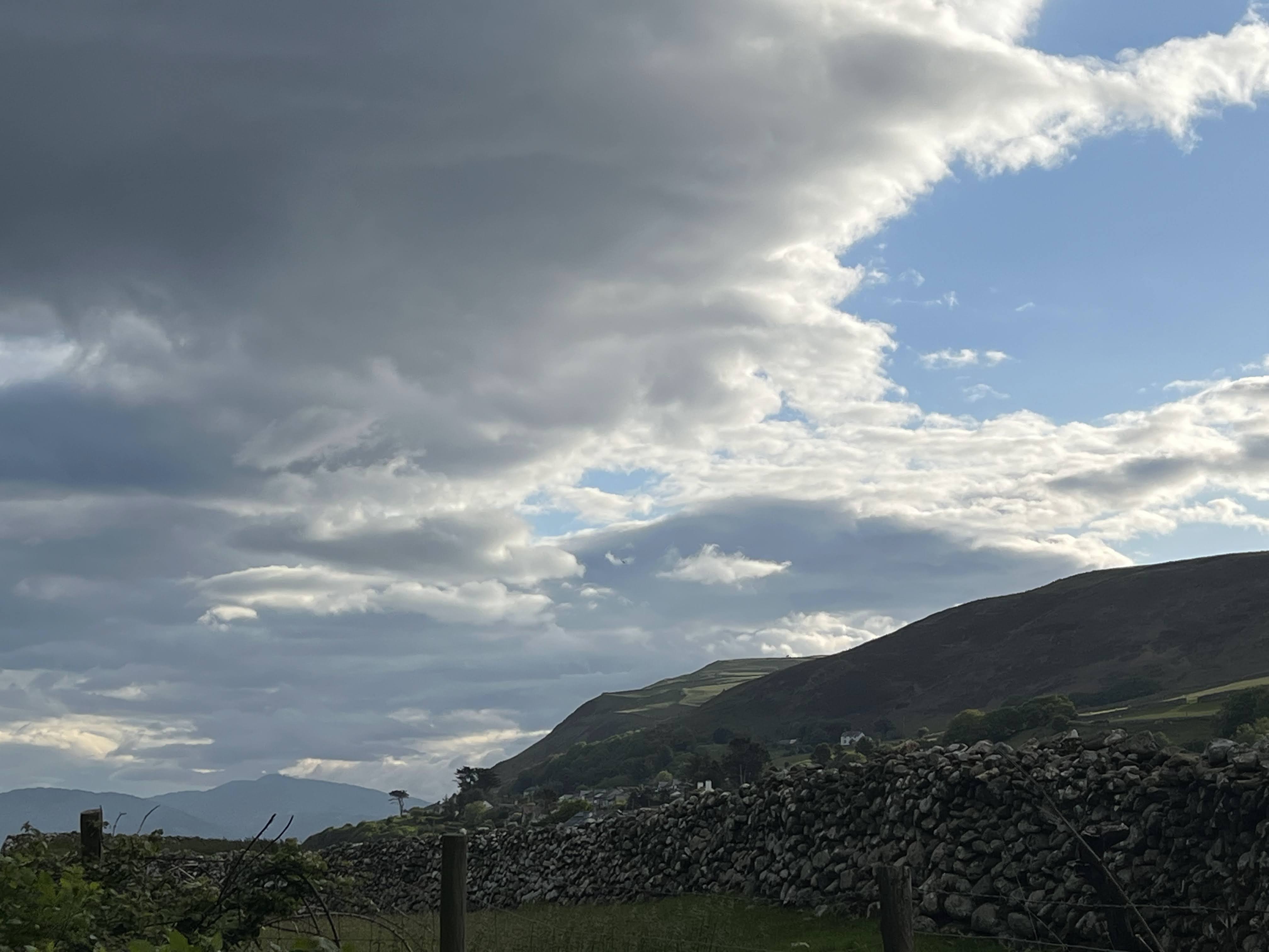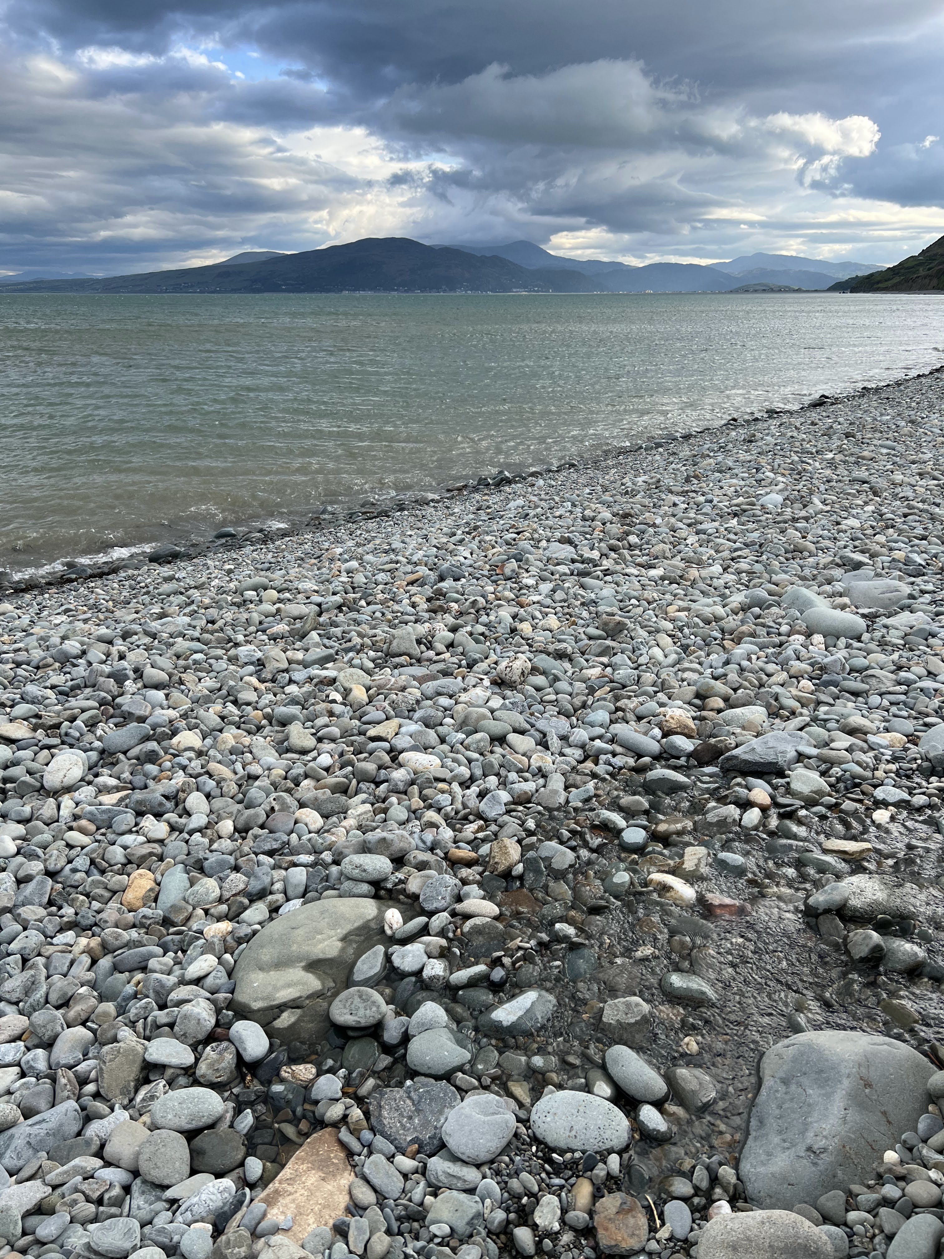 The hills behind my cottage. Green and velvety.The path to the sea runs along a creek.Mountains, sea, stony beach.Not sure if this was art or accident.Mt. Snowden back there somewhere.I love rock beaches. Love love love. The center rock (white with orange and red stripes) is the “spoke to me” rock that came home with me. The textures. Also, burbling water from a streamlet.End of the road.More Art by Nature.Such a pretty little village is Llwyngwril.Ye Shall Not Pass!!Whimsey, courtesy of village residents.Embiggen for clues!Clues.The Green Man Abides.Community Store Booty!This was the best. Just the best. I had brought some really lovely coffee with me from Hay-on-Wye.Perfect breakfast. Welsh bacon is SO GOOD! As are British eggs. And blackcurrant jam.My clothing was in sore, sore need of laundering at this point. First laundry in 2.5 weeks.I whiled away the afternoon, and it was lovely. Tea and McVities biscuits.A Hay find, Carol Shields’ “Larry’s Party” was excellent domestic drama, beautifully written.The evening sky.Still hours from sunset, dramatic celestial spotlights.