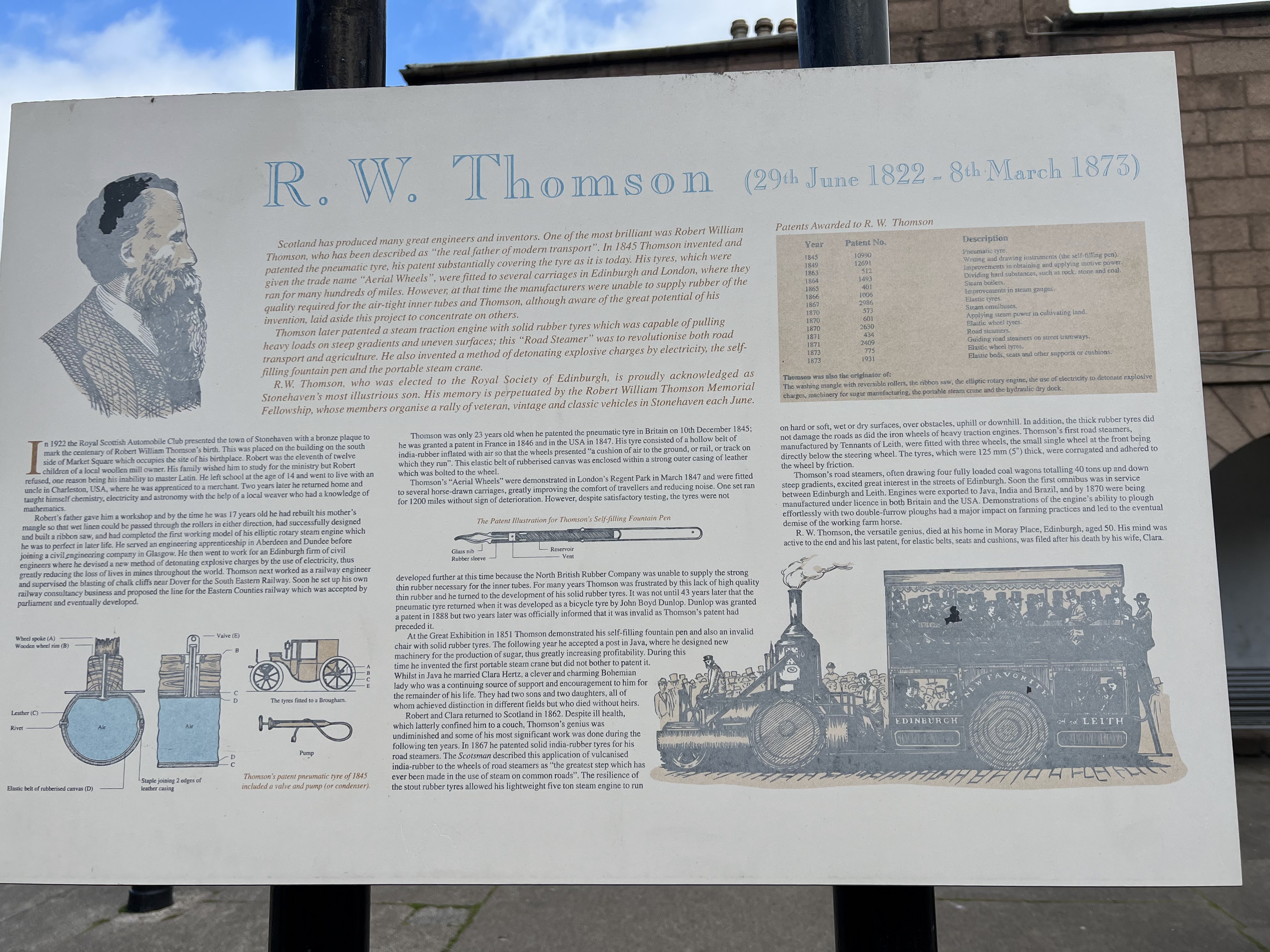 On board the train to Stonehaven. These trains are super posh!A lovely mile’s walk to town from the station. So much lilac everywhere in Wales and Scotland this time of year! Mmmmmmmmm.I have questions.R.W. Thomson, self-taught inventor of the pneumatic tire, electric detonator for explosives, self-filling fountain pen, and so much more. Born in Stonehaven, Aberdeenshire!