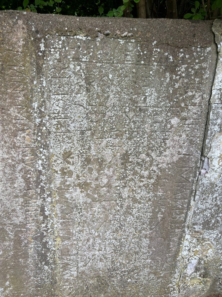 These gravestones form part of the wall beside the public footpath behind the Police Station in Bog Well Lane. They were found nearby during the 19th Century in an area used for burying plague (or pest) victims.