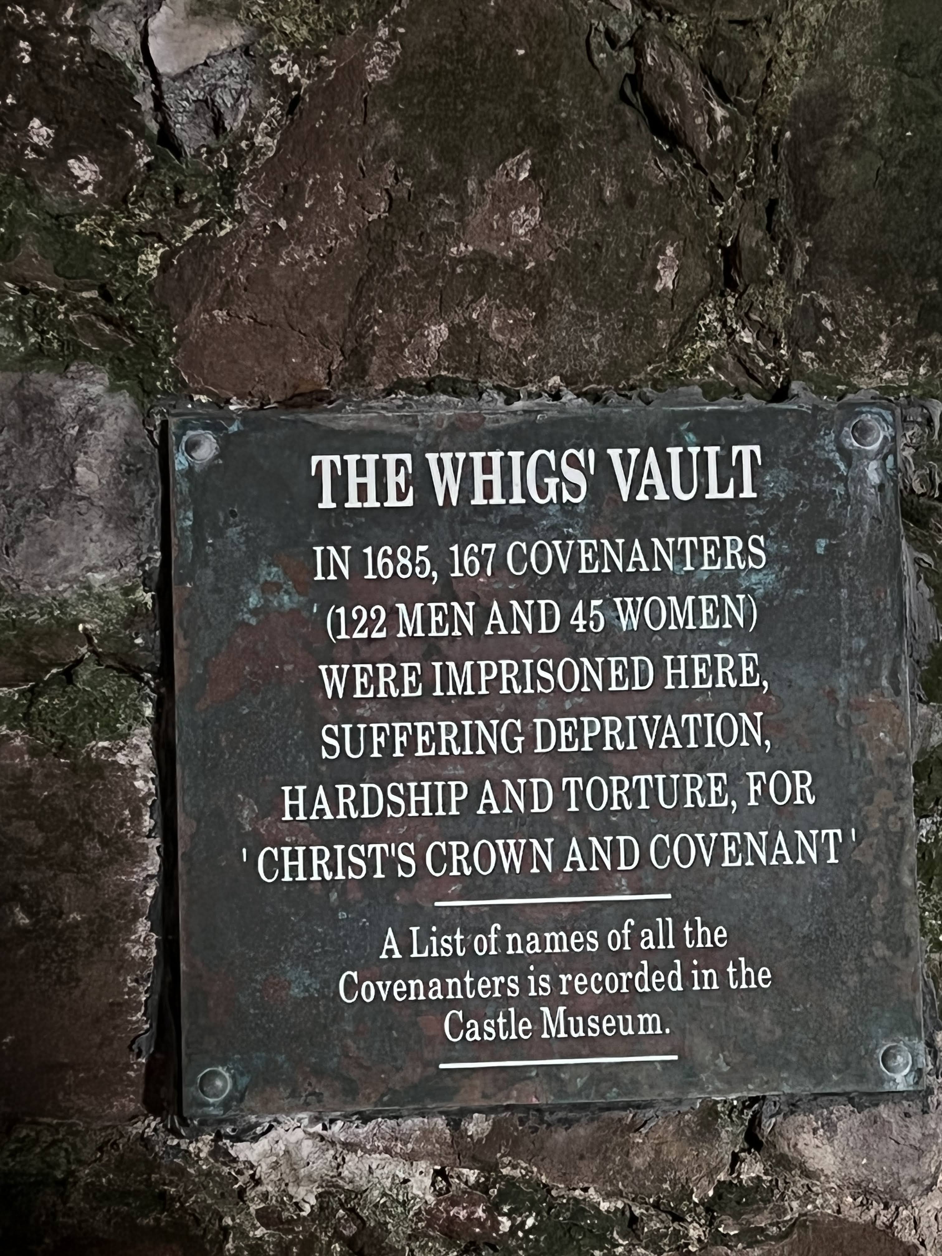 One of the darkest chapters of Dunnottar’s history is that of the Whig’s Vault. In 1685, one hundred and twenty two men and forty five women, whose crime was their refusal to acknowledge the King’s supremacy in spiritual matters. They were imprisoned with little food and no sanitation from 24 May until the end of July in the gloomy, airless cellar. Thirty seven Whigs finally agreed to take the oath of allegiance and were released. Twenty five escaped, however fifteen were recaptured and two fell to their deaths during the attempt. A further five prisoners also died.