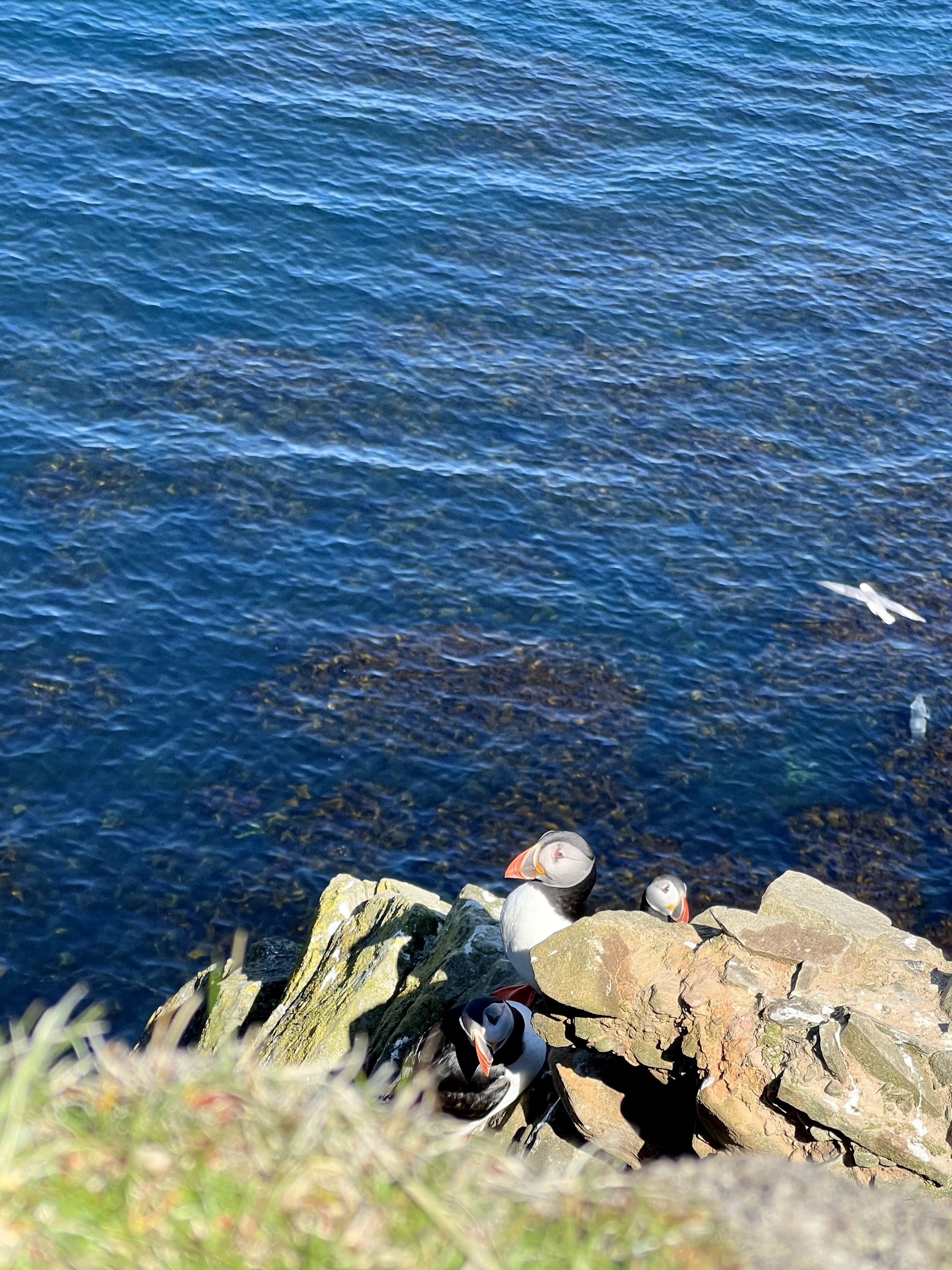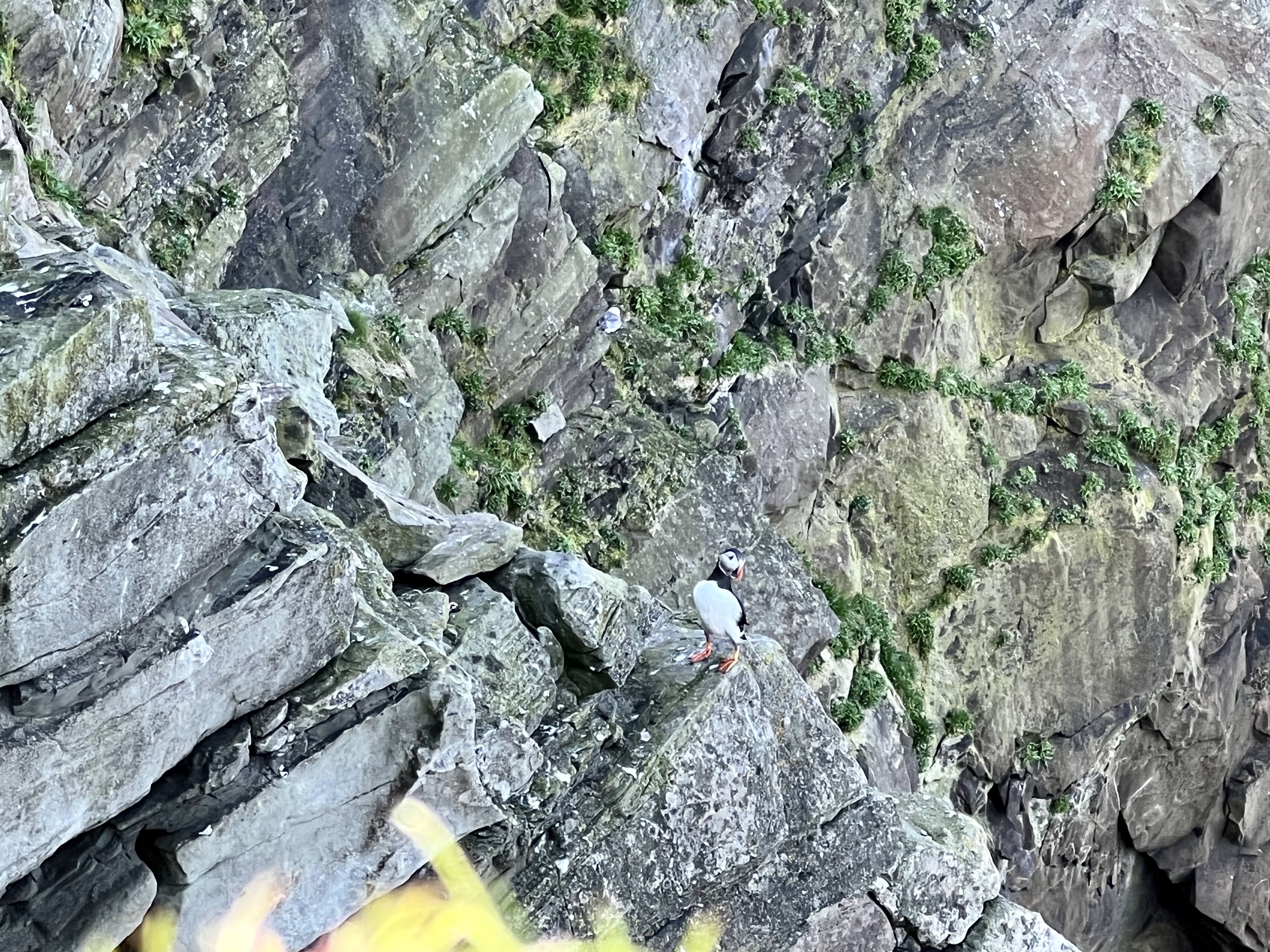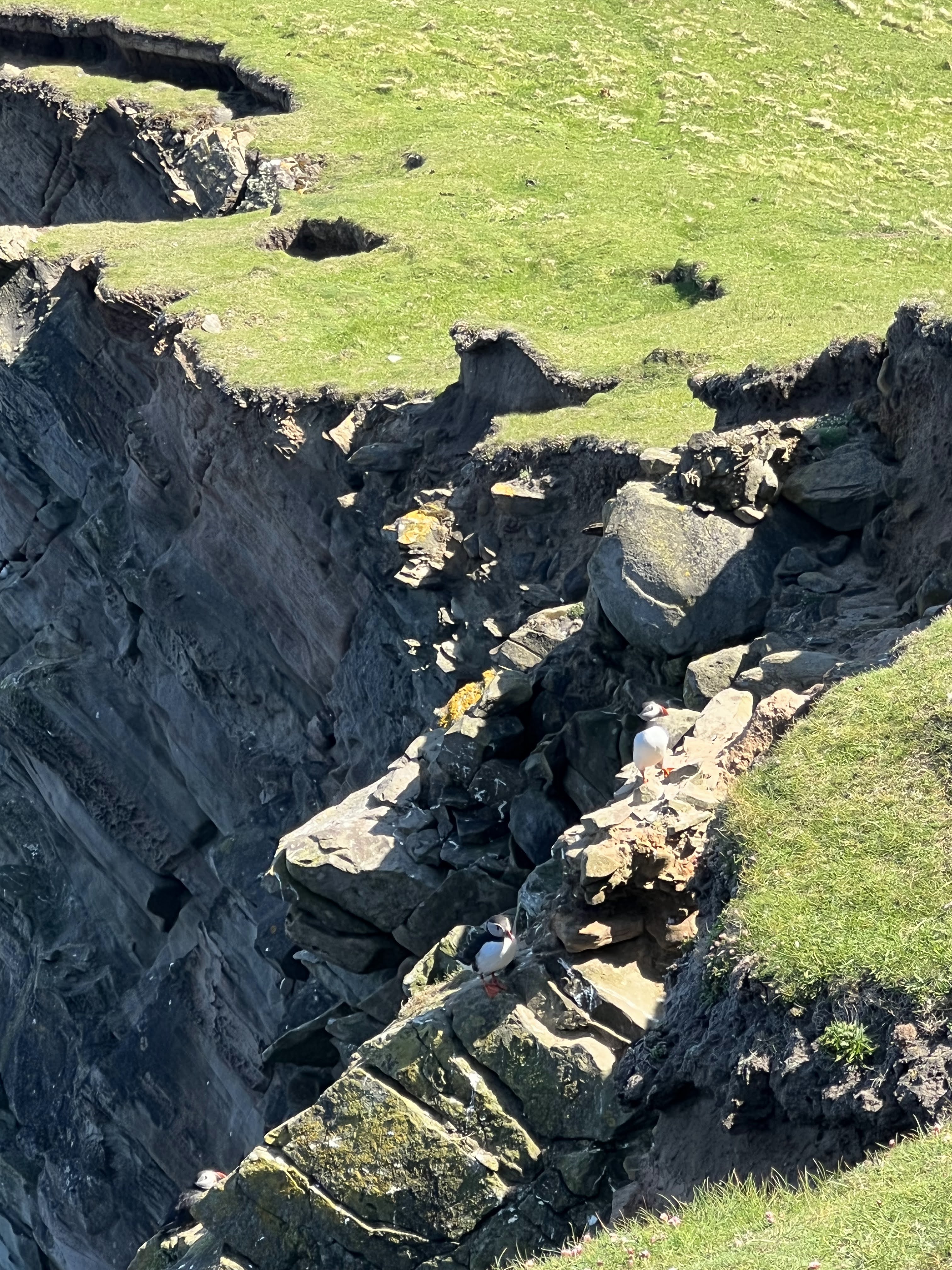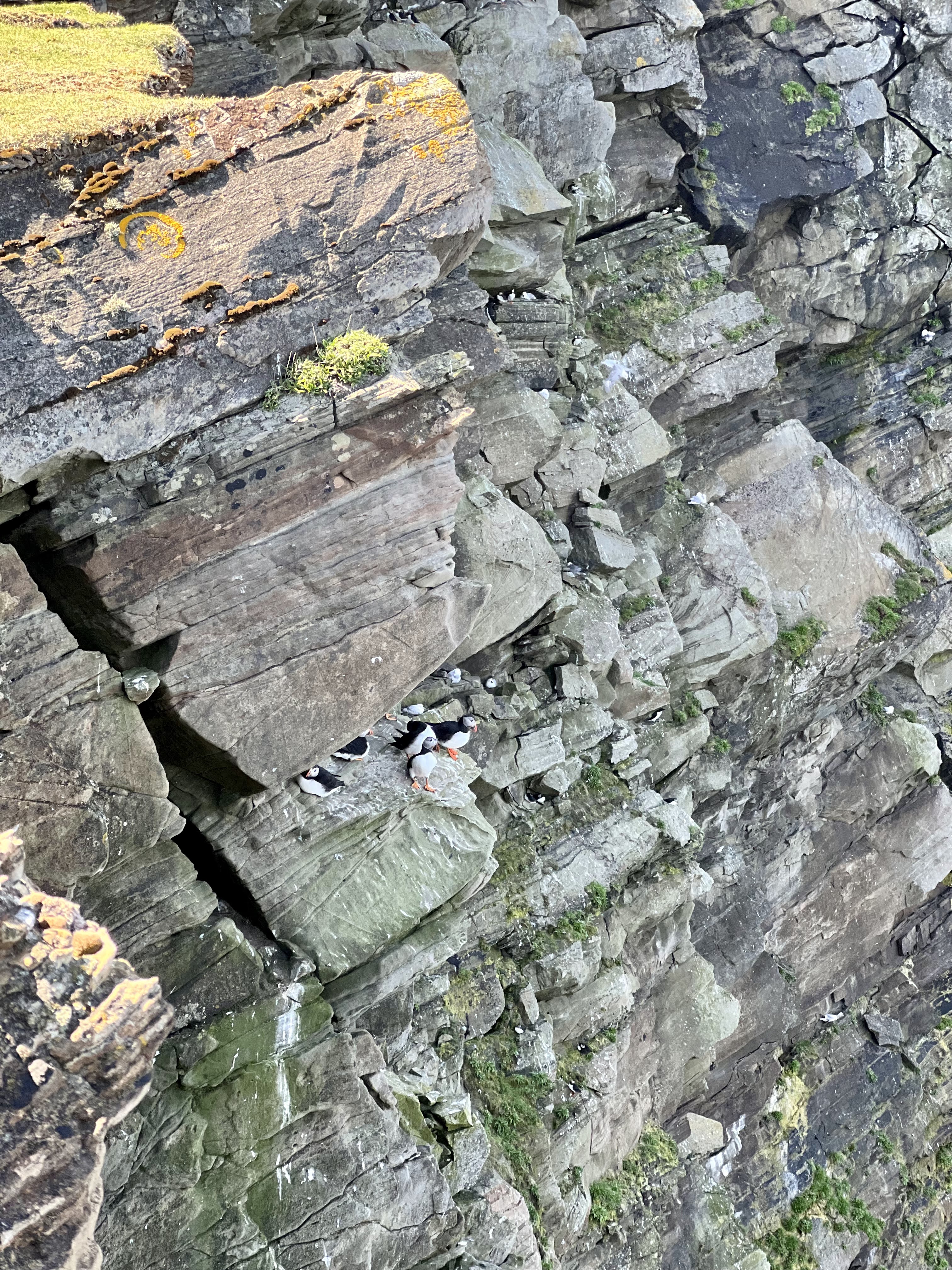 As I got closer to the edge, the world of the cliffs was revealed to me. A great colony of nesting puffins. I might say, I was SO GRATEFUL that there was little to no wind, enabling me to get right up to the edge. I think for the rest of this entry, I’ll mostly let these little guys speak for themselves.