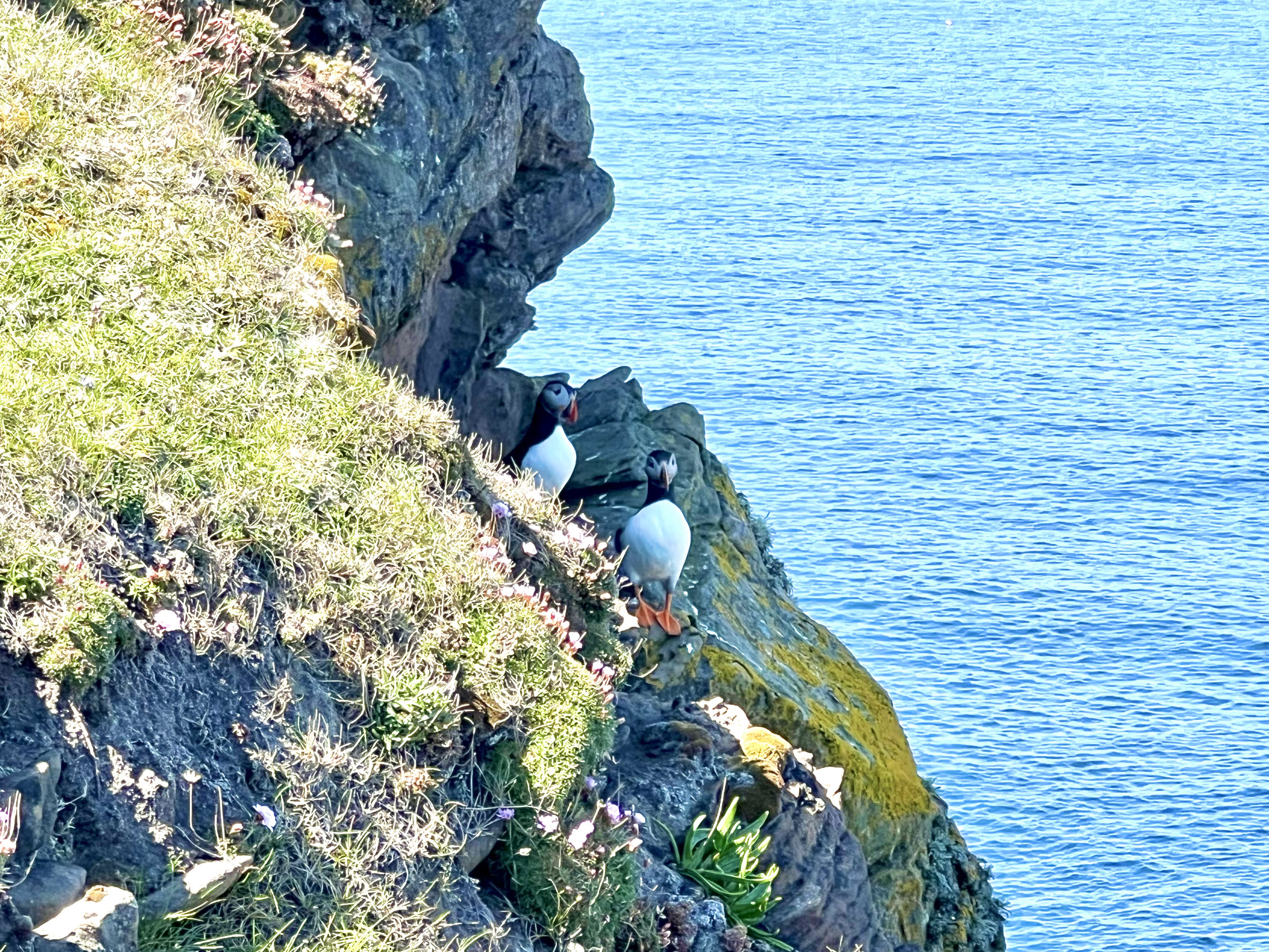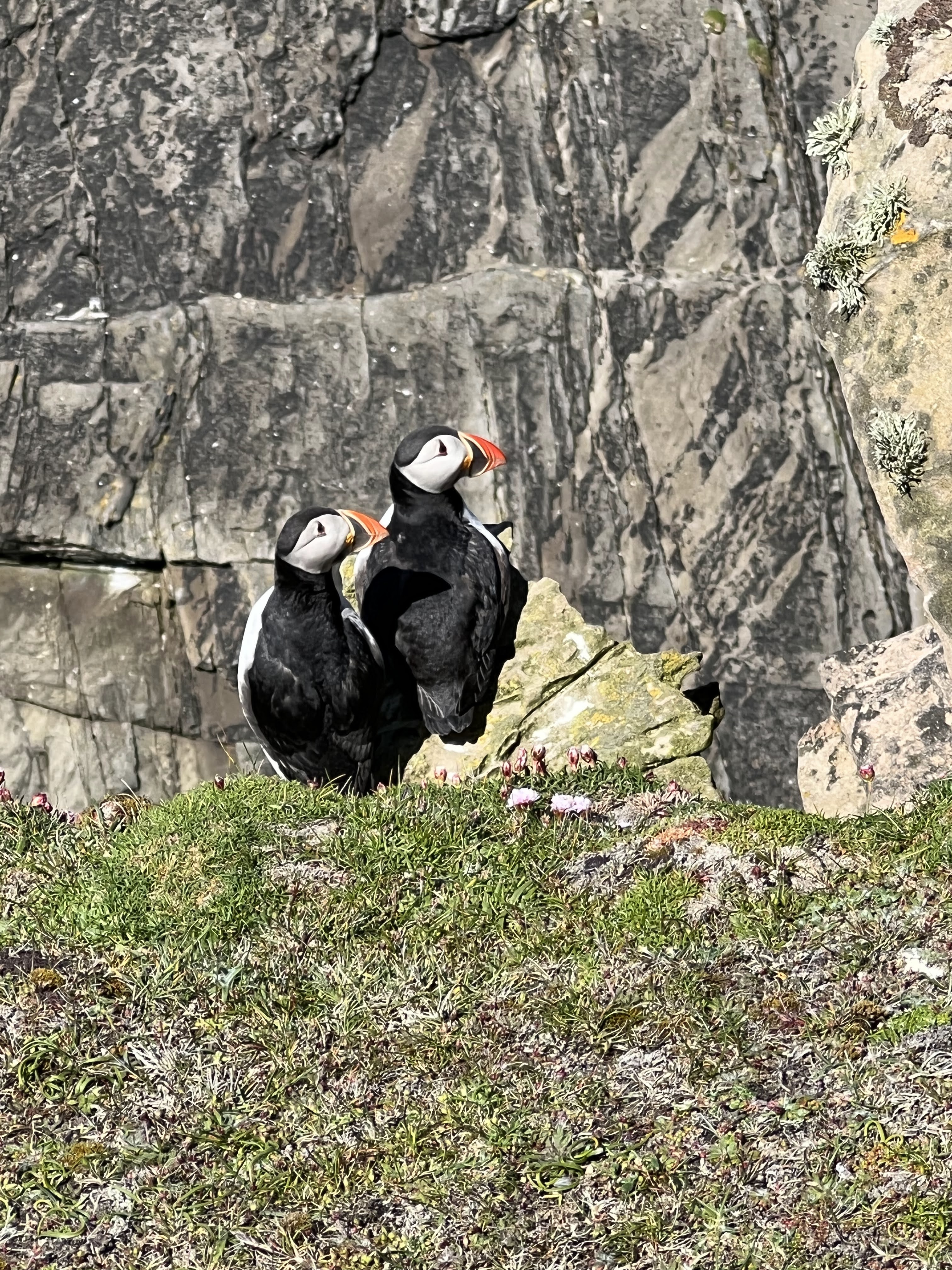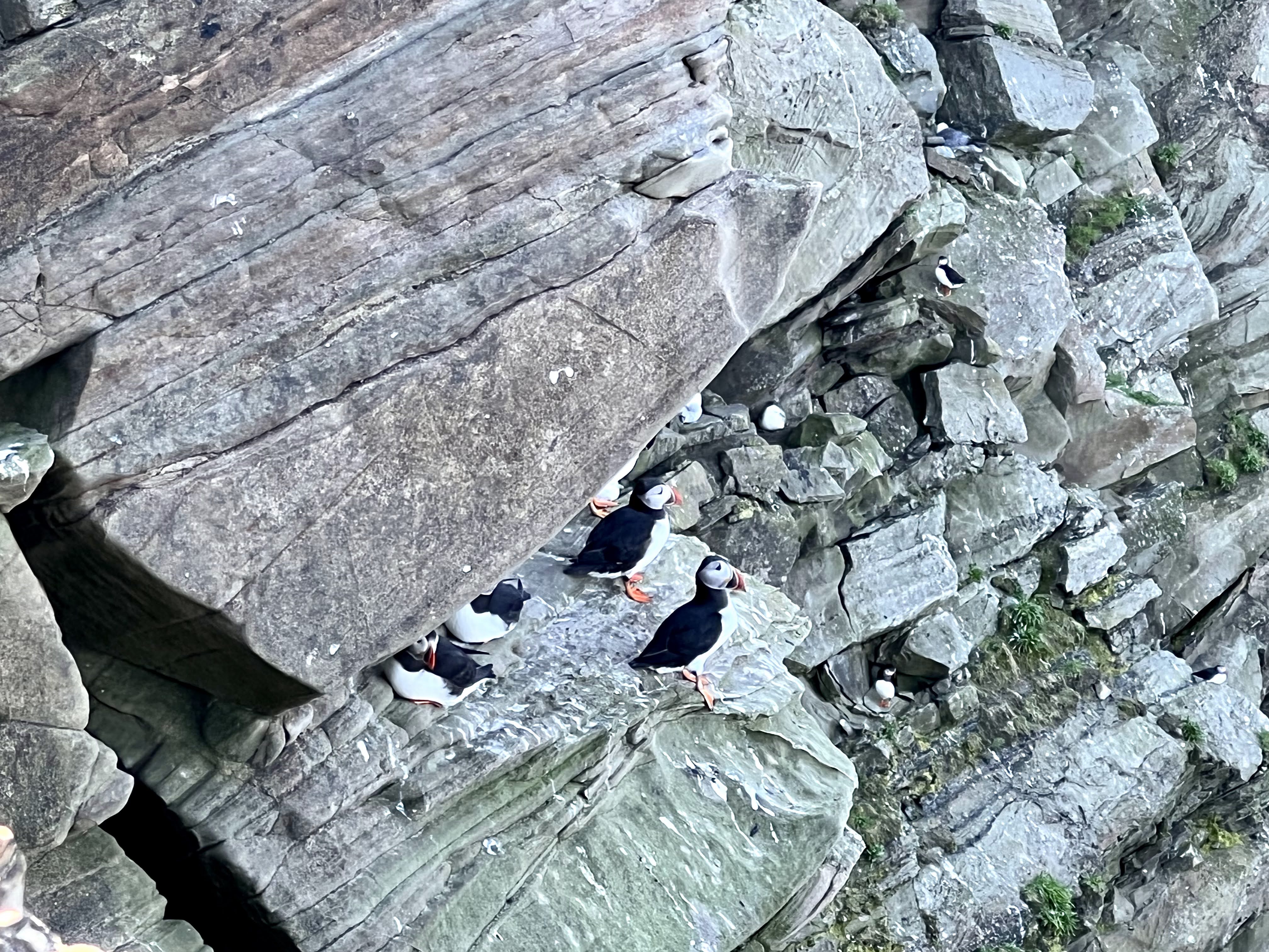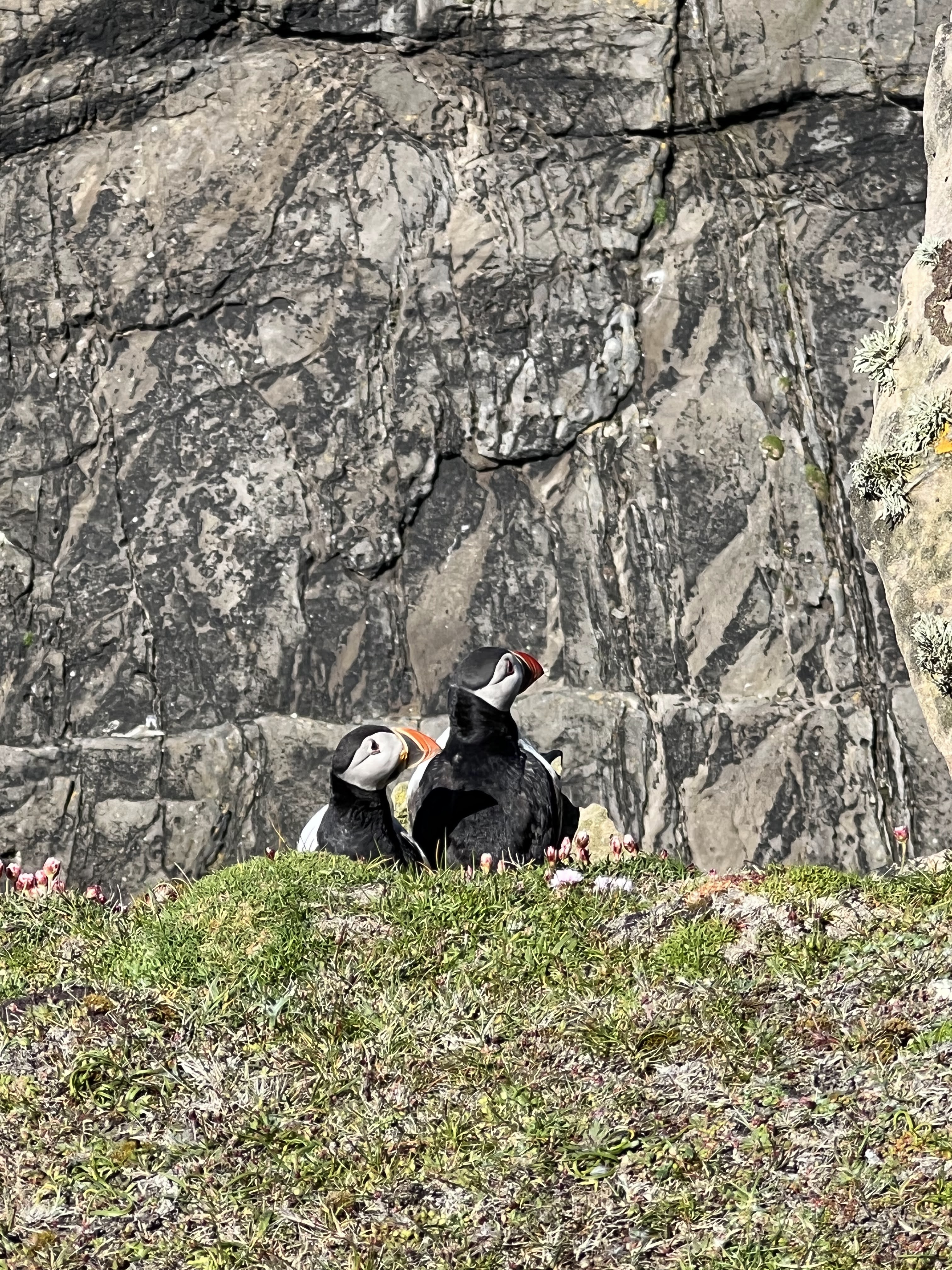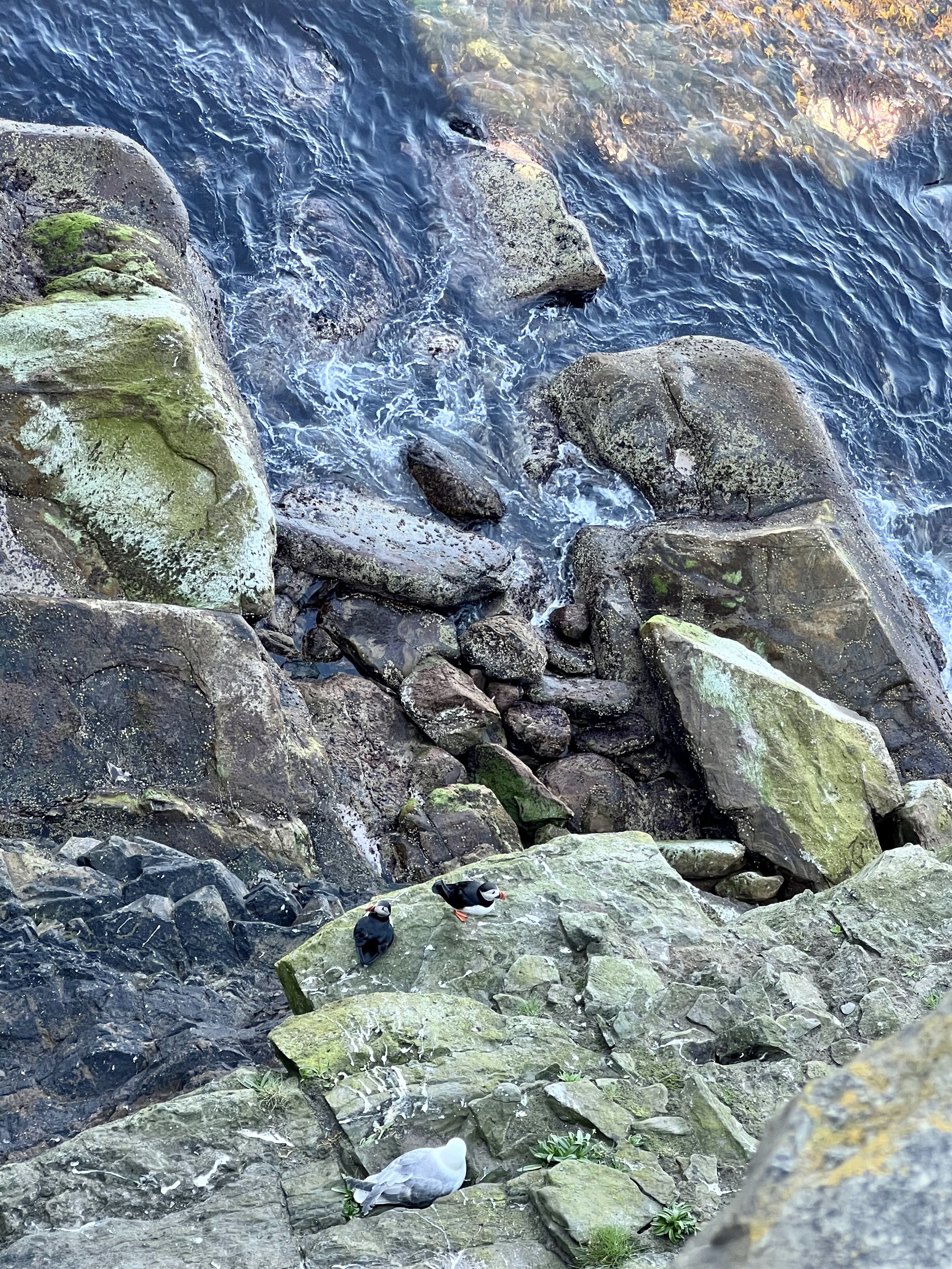 As I got closer to the edge, the world of the cliffs was revealed to me. A great colony of nesting puffins. I might say, I was SO GRATEFUL that there was little to no wind, enabling me to get right up to the edge. I think for the rest of this entry, I’ll mostly let these little guys speak for themselves.