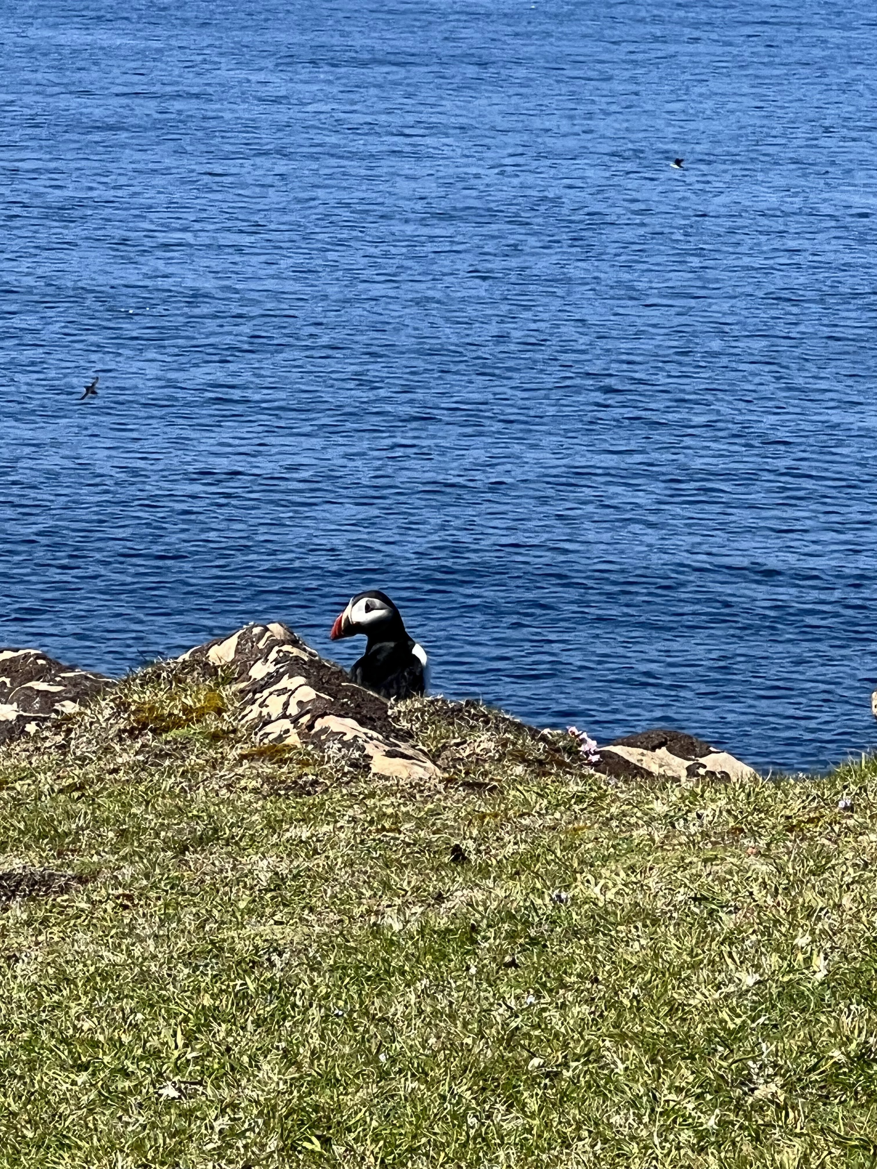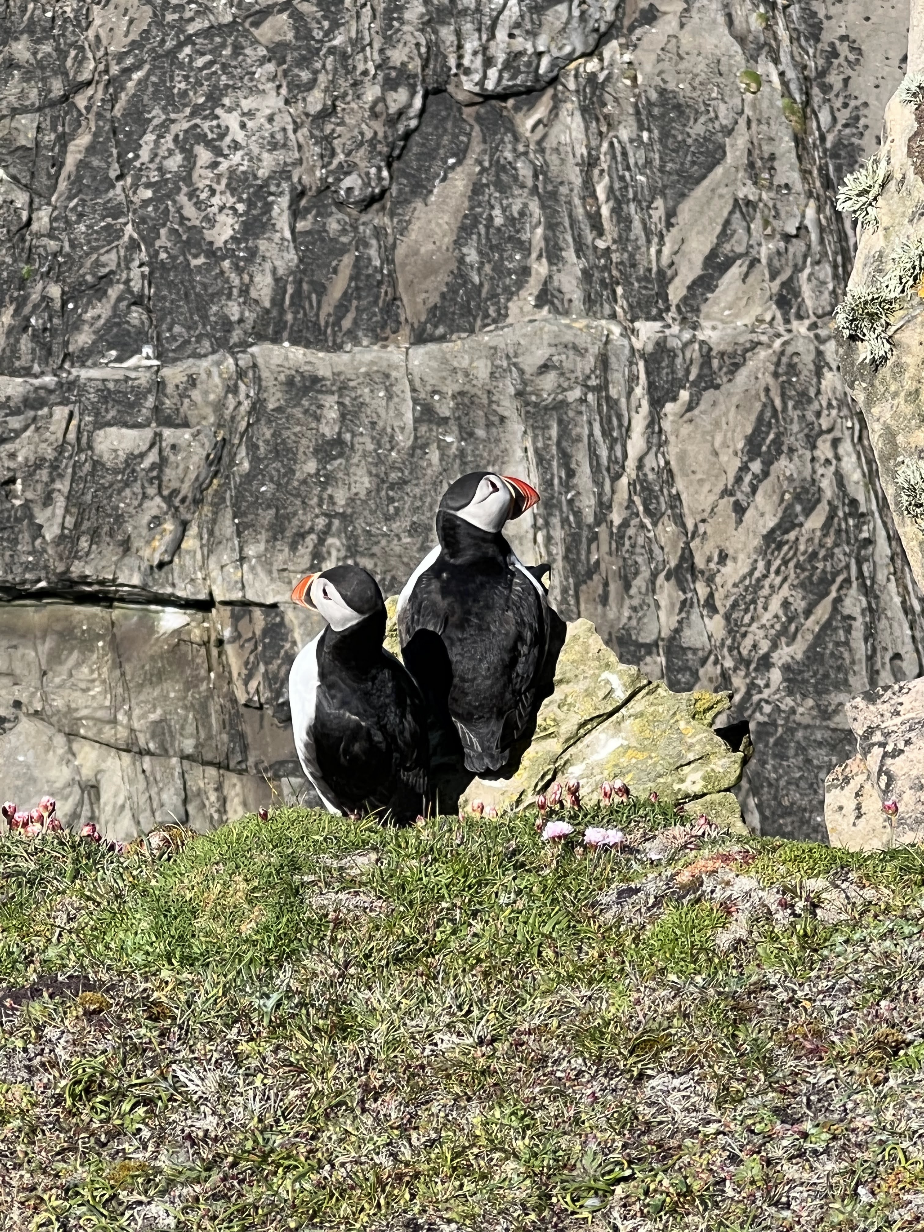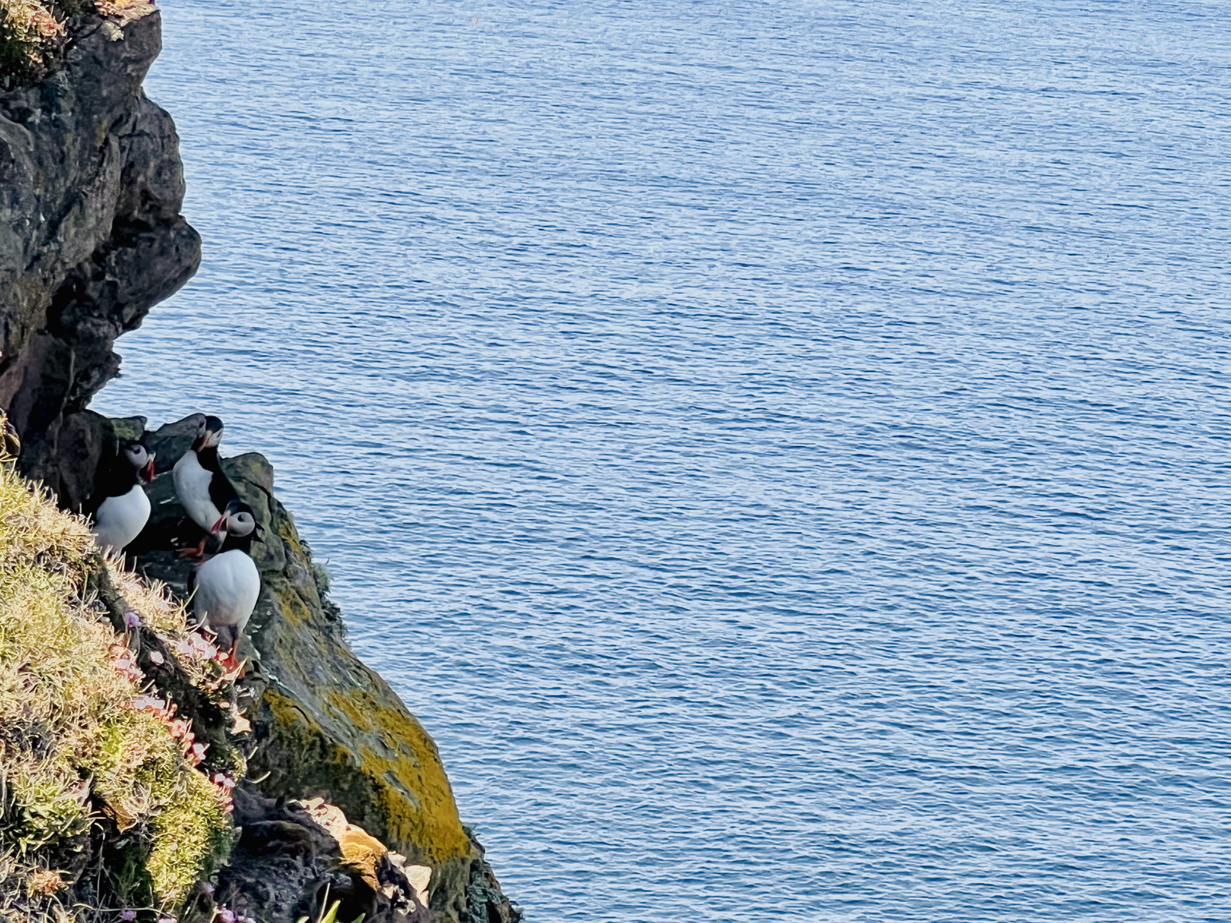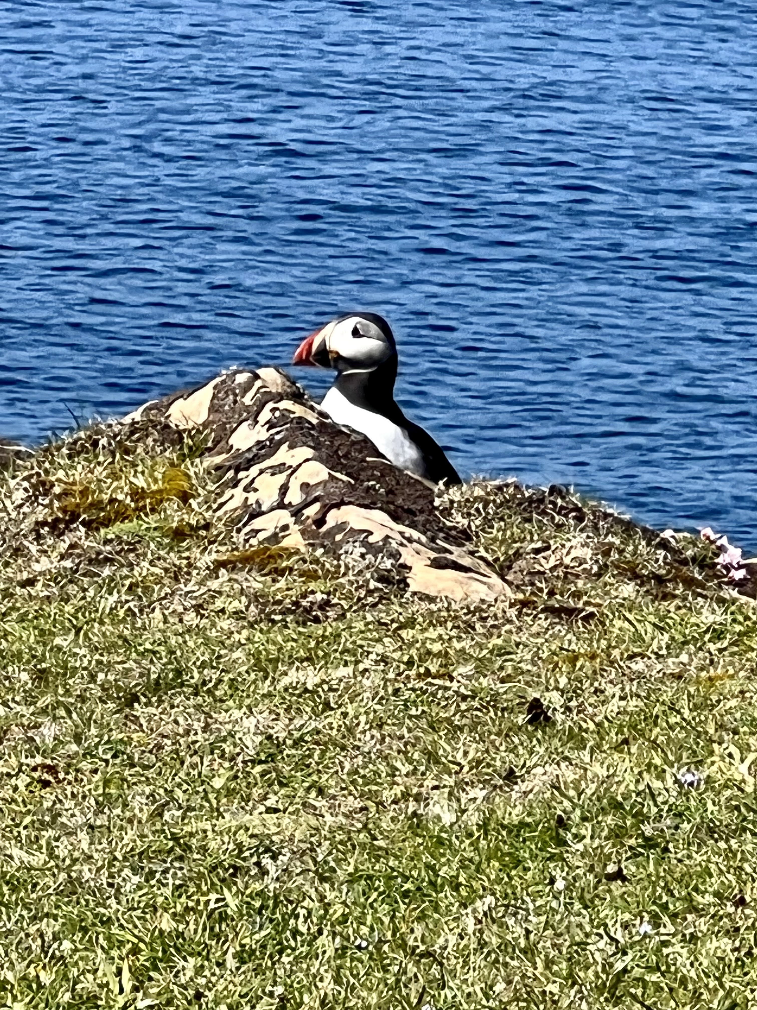 As I got closer to the edge, the world of the cliffs was revealed to me. A great colony of nesting puffins. I might say, I was SO GRATEFUL that there was little to no wind, enabling me to get right up to the edge. I think for the rest of this entry, I’ll mostly let these little guys speak for themselves.