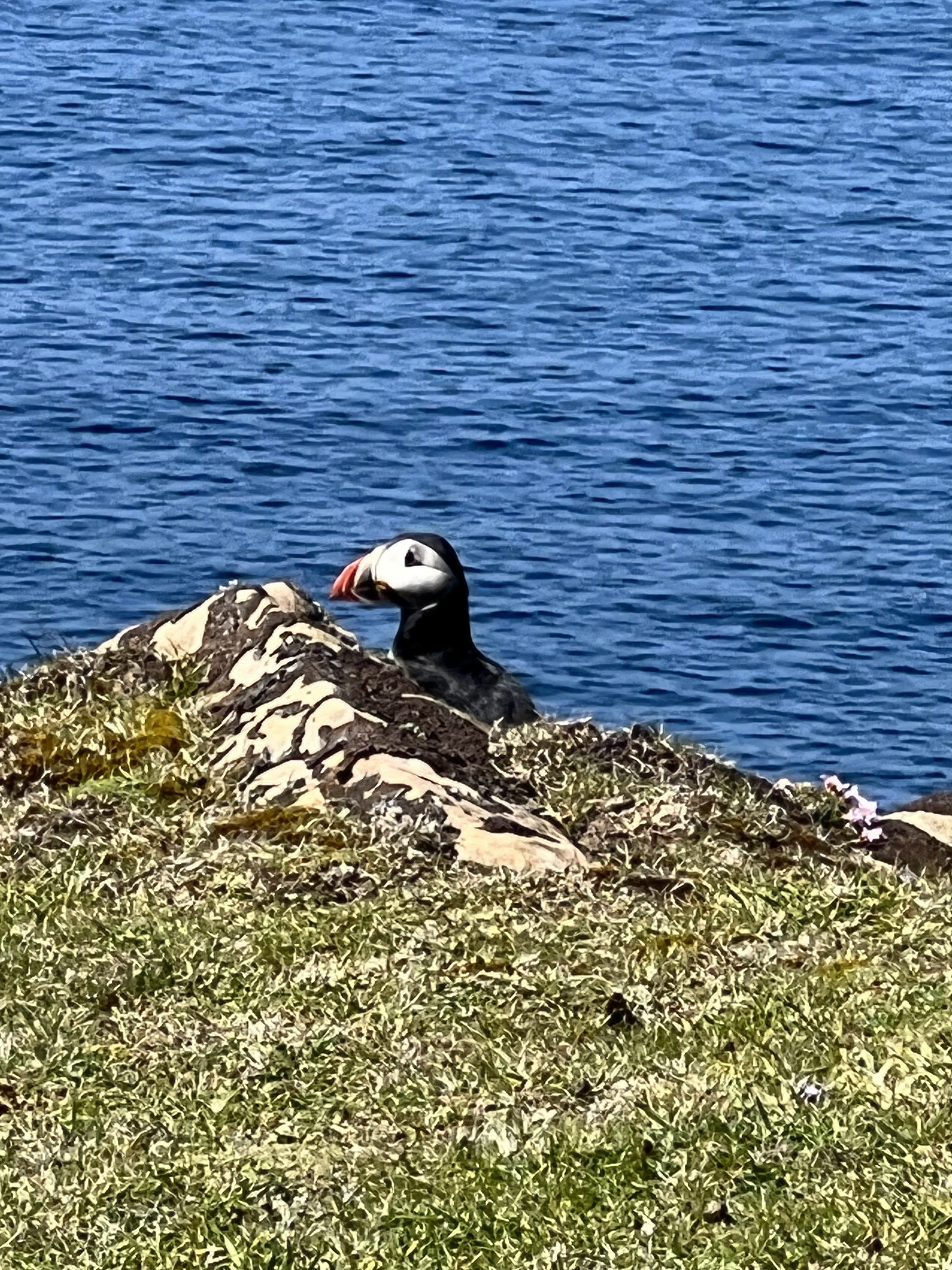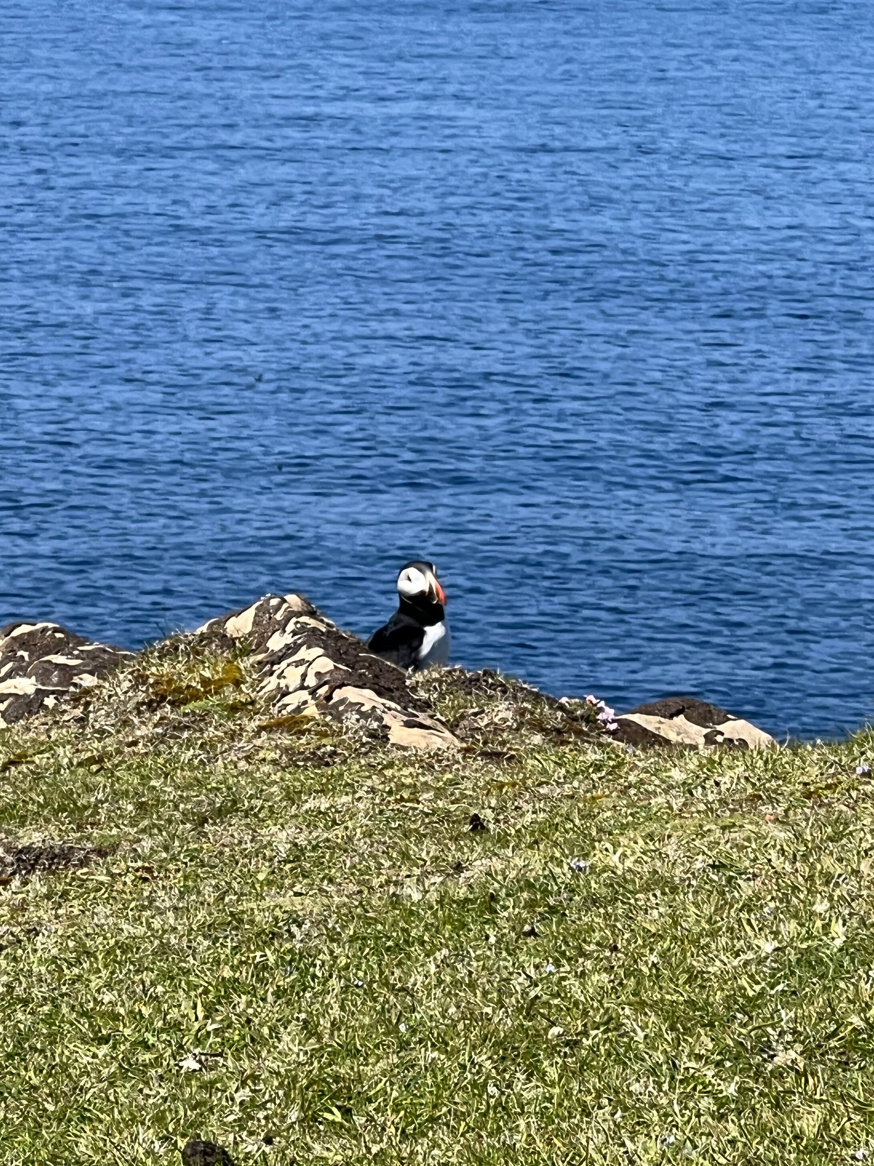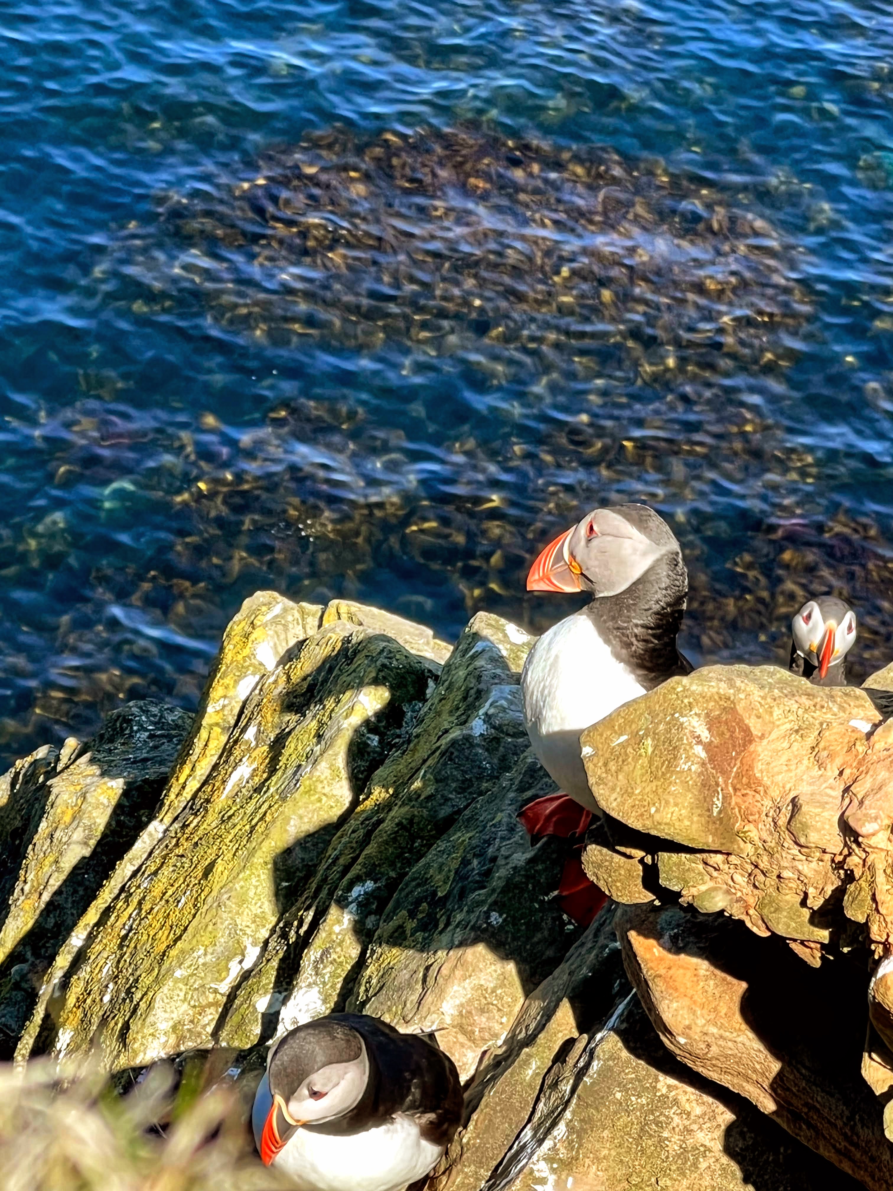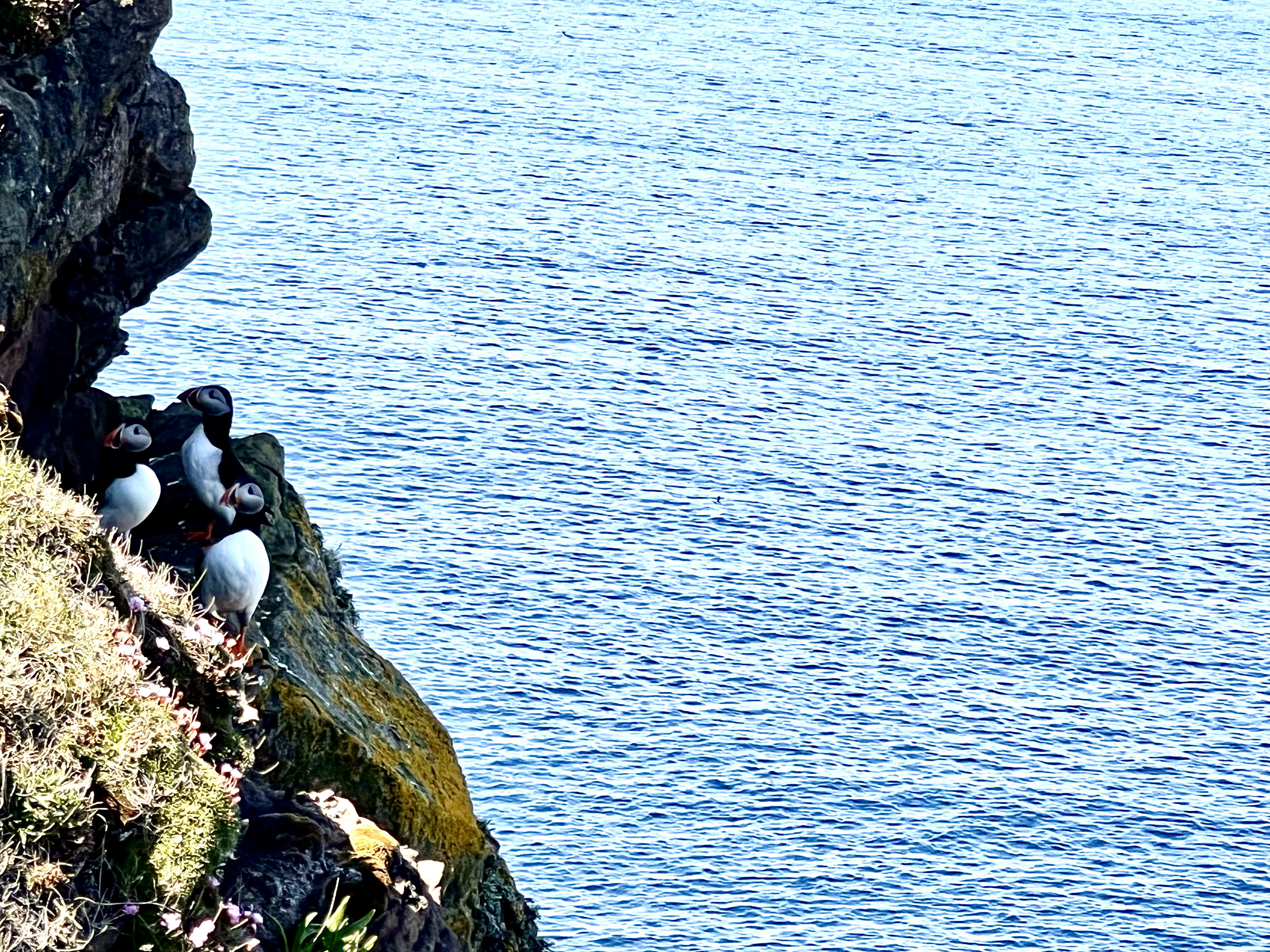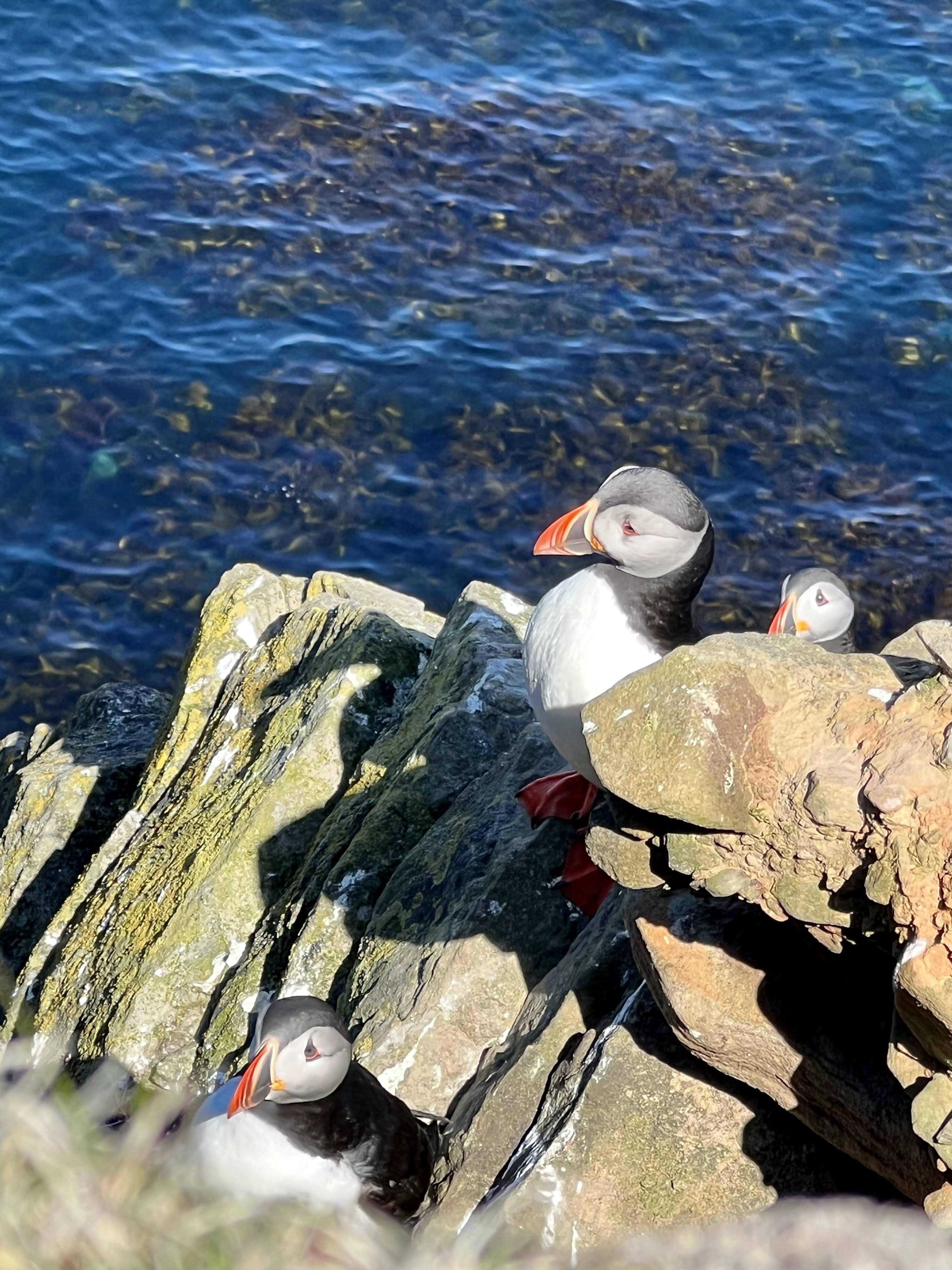 As I got closer to the edge, the world of the cliffs was revealed to me. A great colony of nesting puffins. I might say, I was SO GRATEFUL that there was little to no wind, enabling me to get right up to the edge. I think for the rest of this entry, I’ll mostly let these little guys speak for themselves.