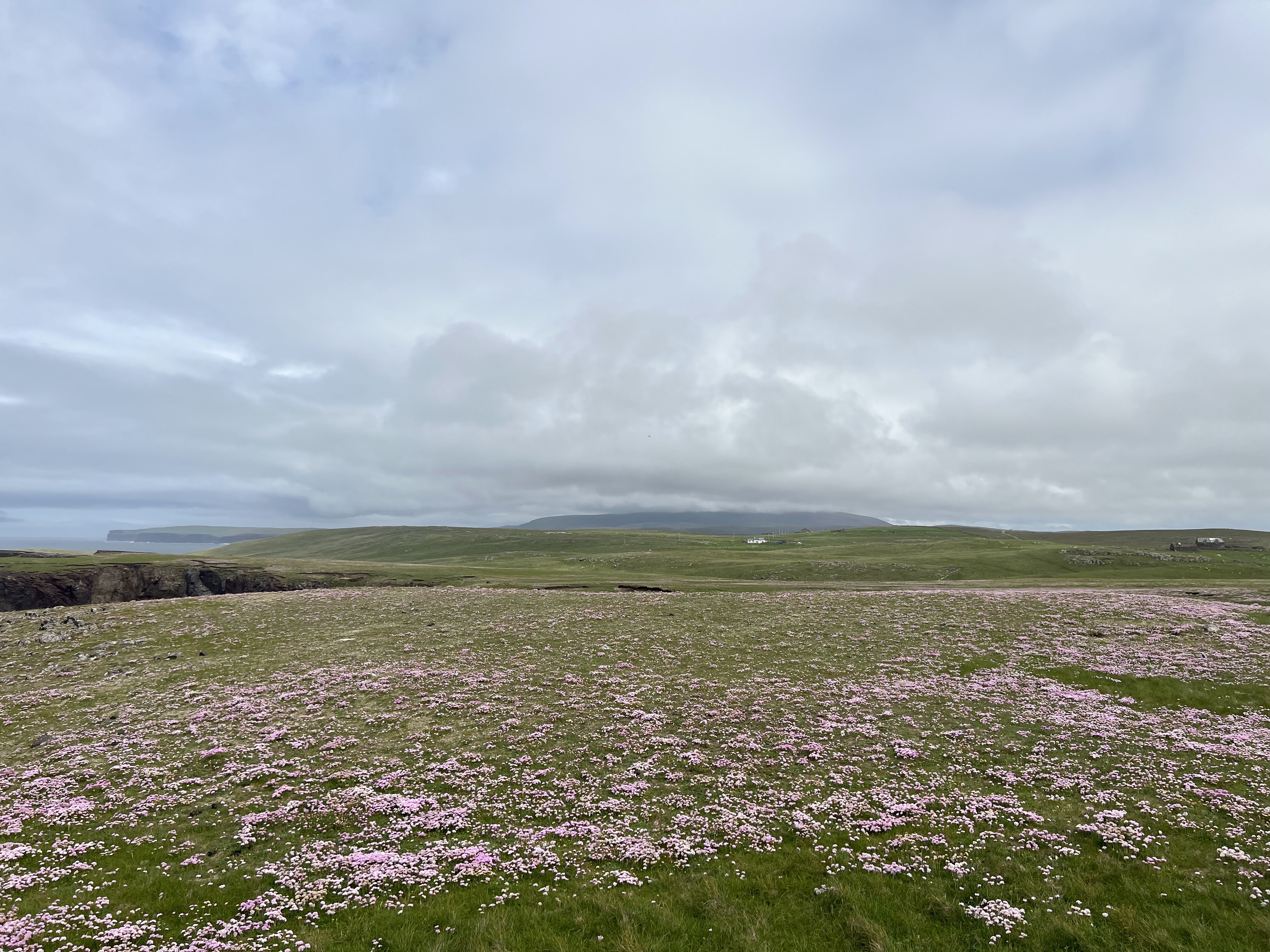 A field of pink. Ronas Hill with its hat on in the far distance. The highest point in Northmavine, which is what this entire region of Shetland is called.