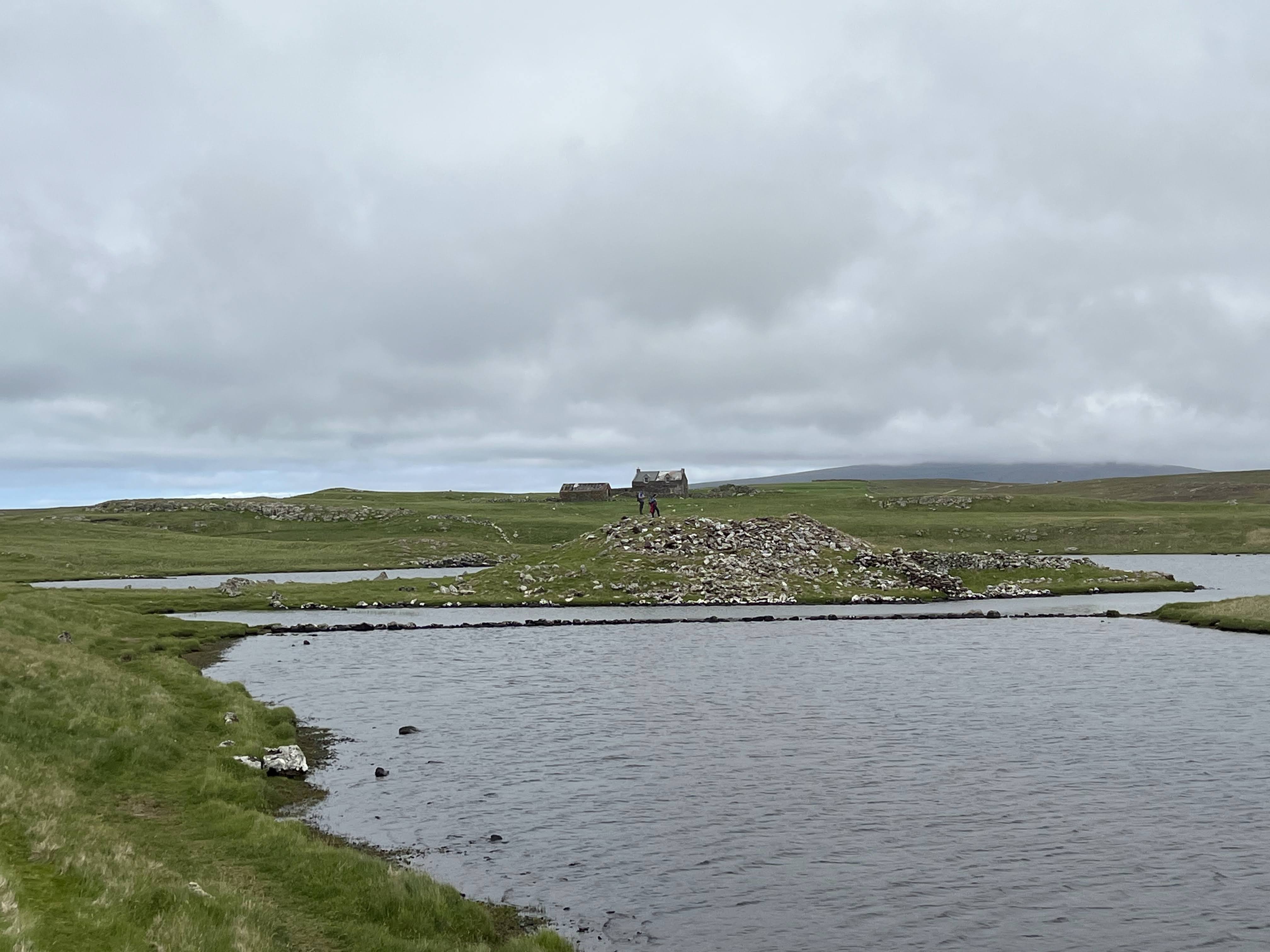 Looking back at the broch, with an old farmhouse in the background.