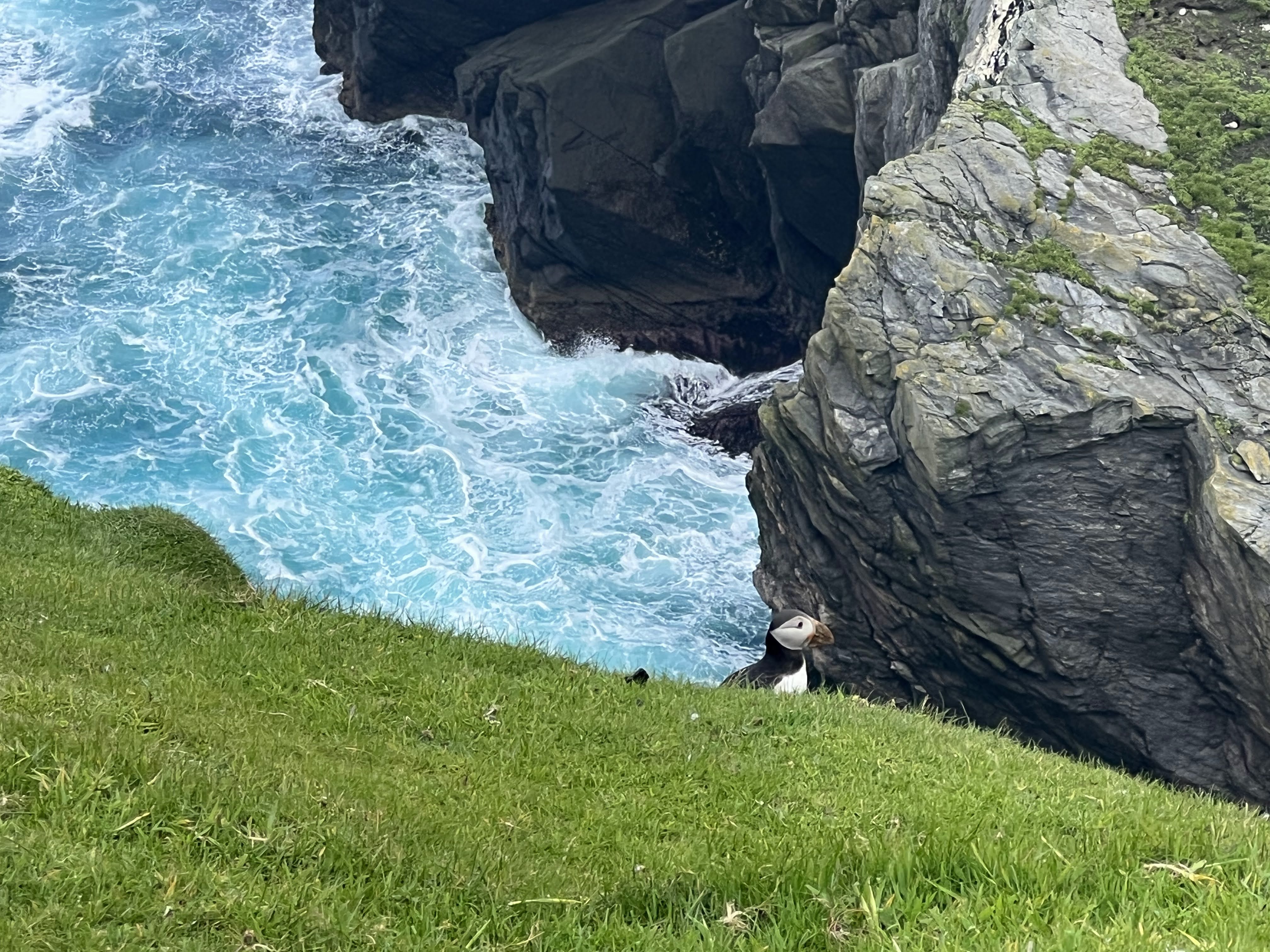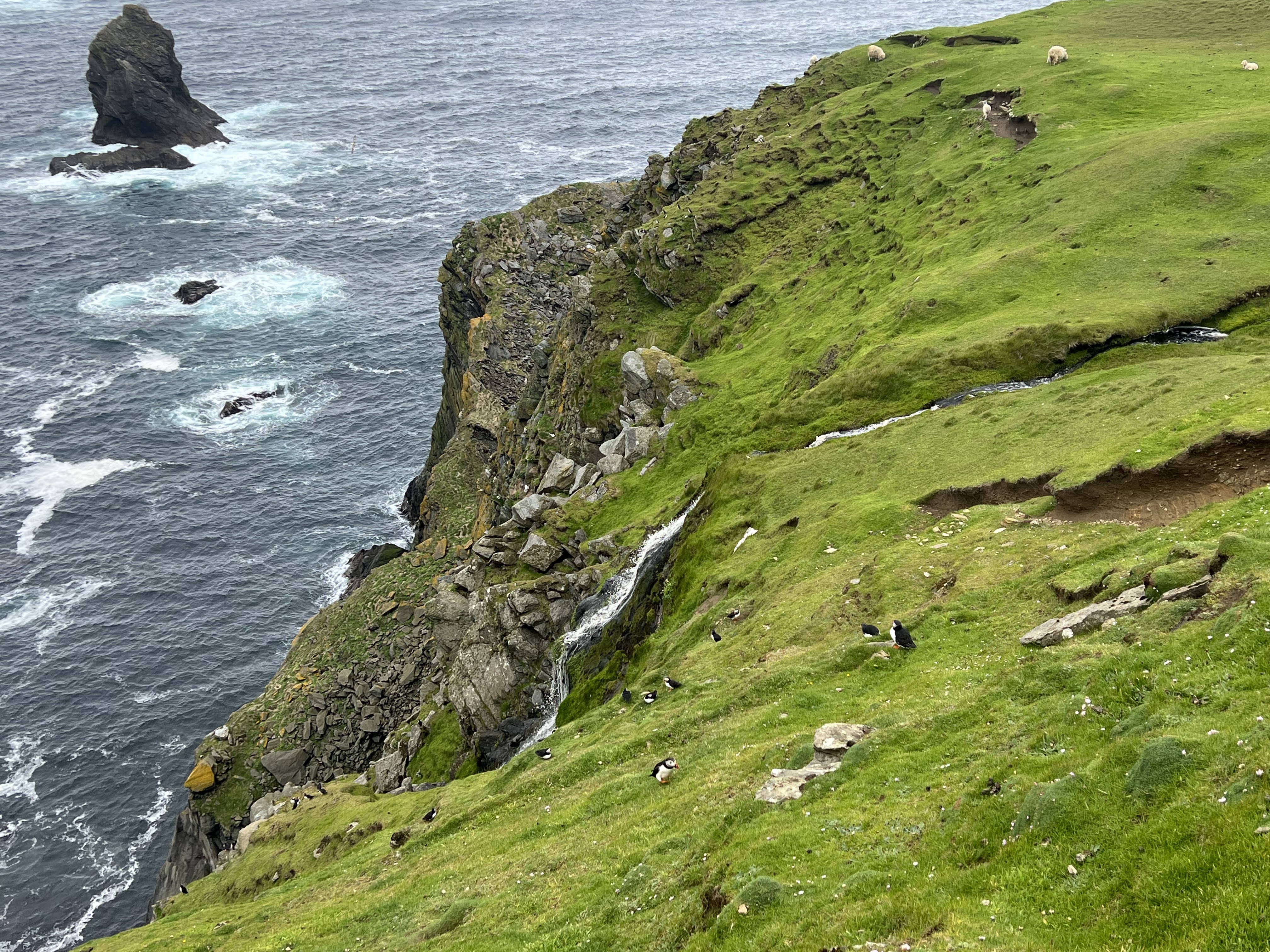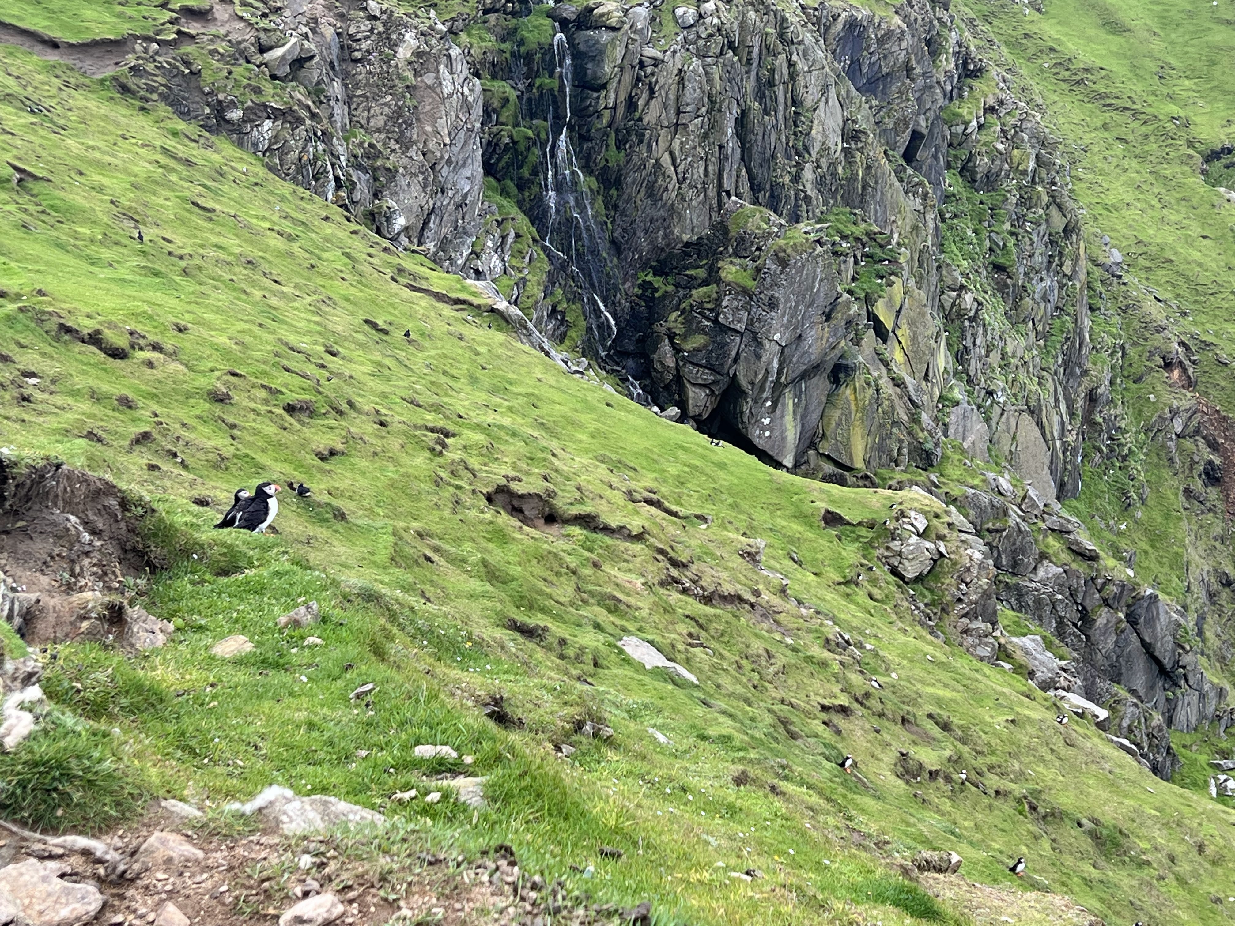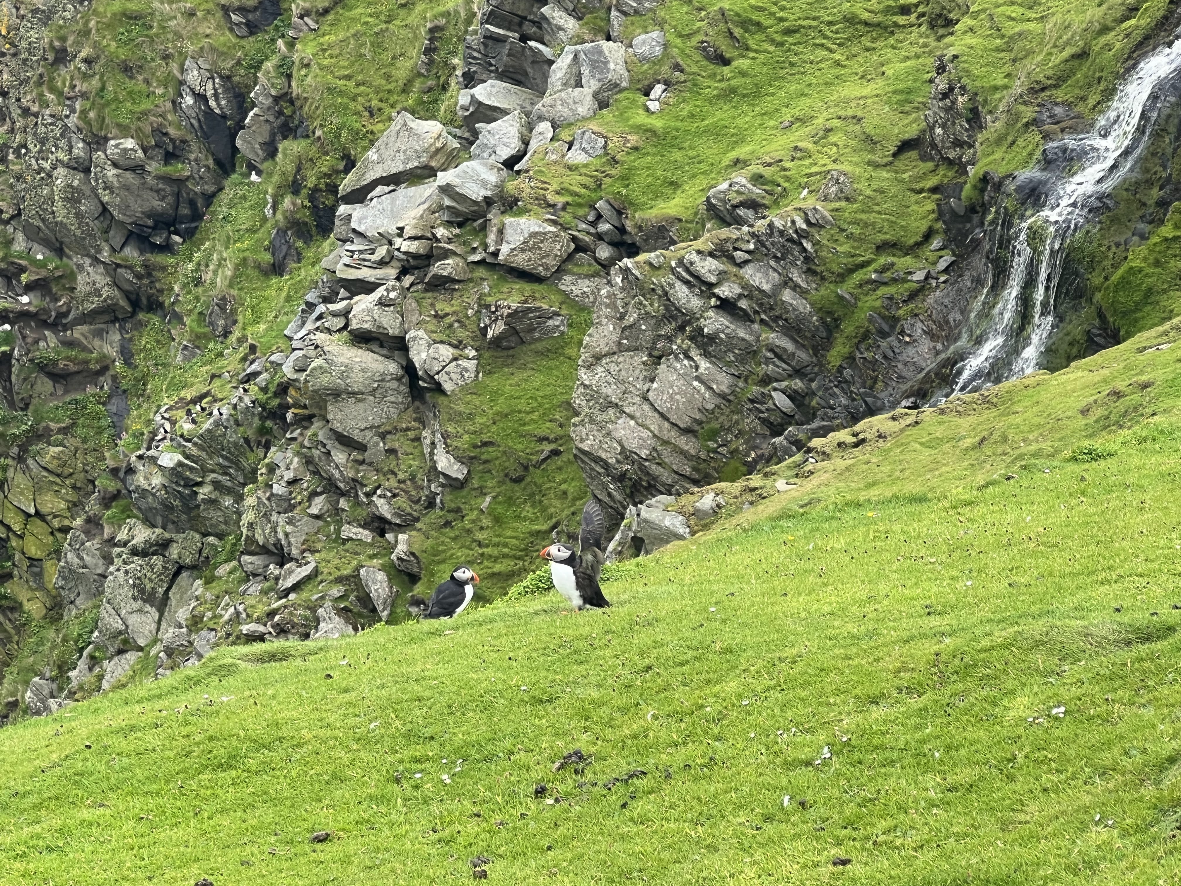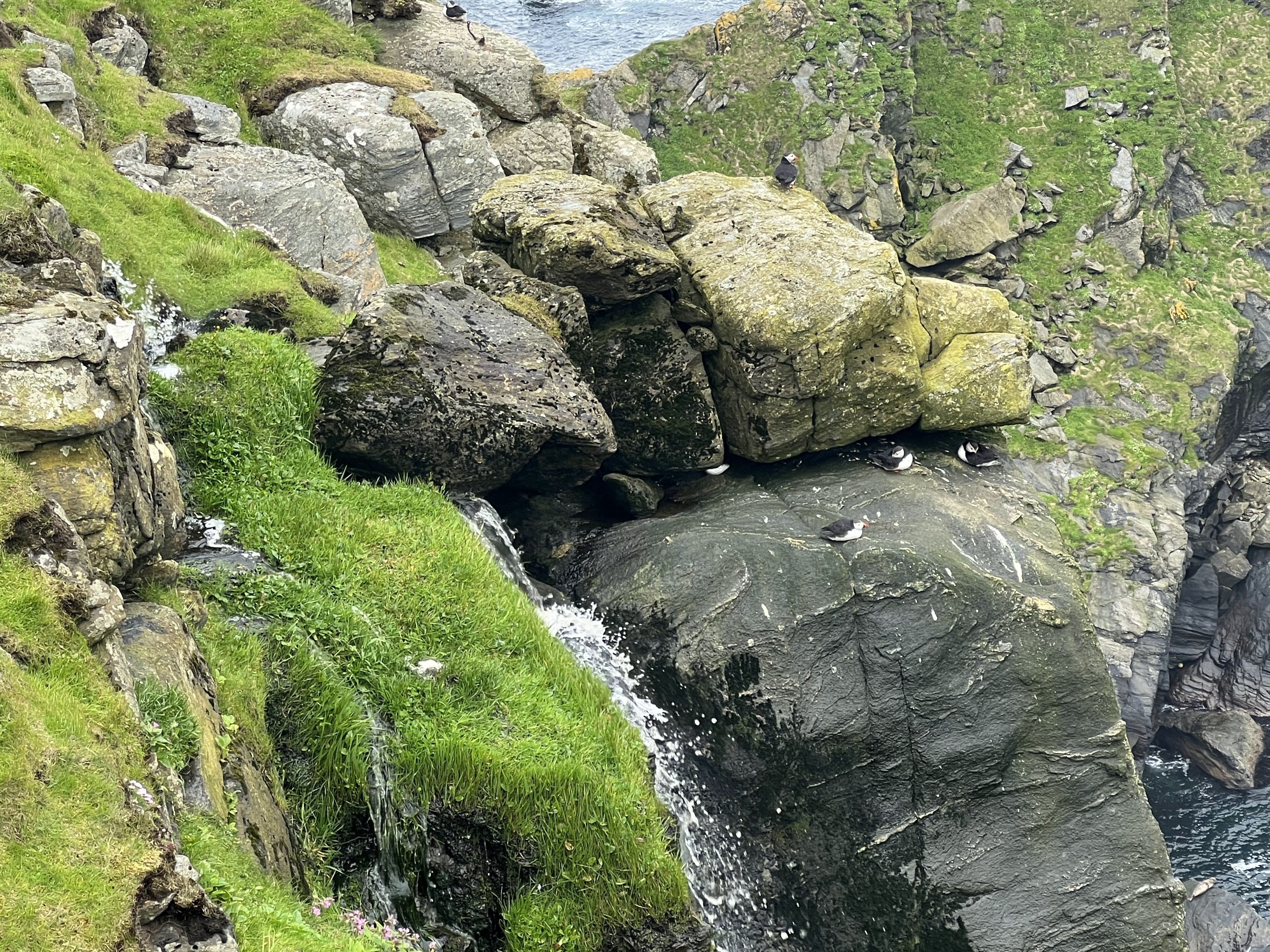 This video is mostly to show off Shetland’s northern coast.As is this photo. And my fine partner, of course.Another bustling colony, with bonus waterfall.A puffin-dotted hillside.Loved this little hunkering-down guy.A confab at the waterfall.
