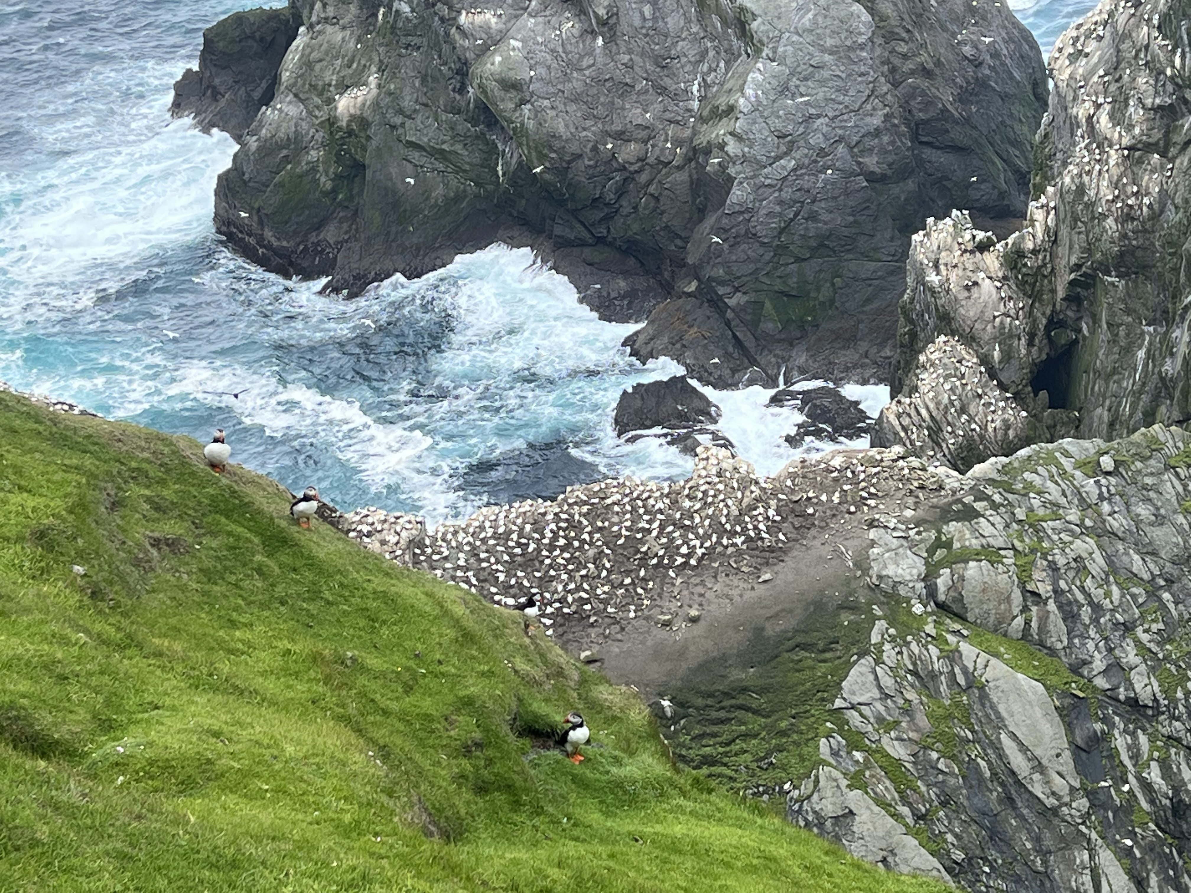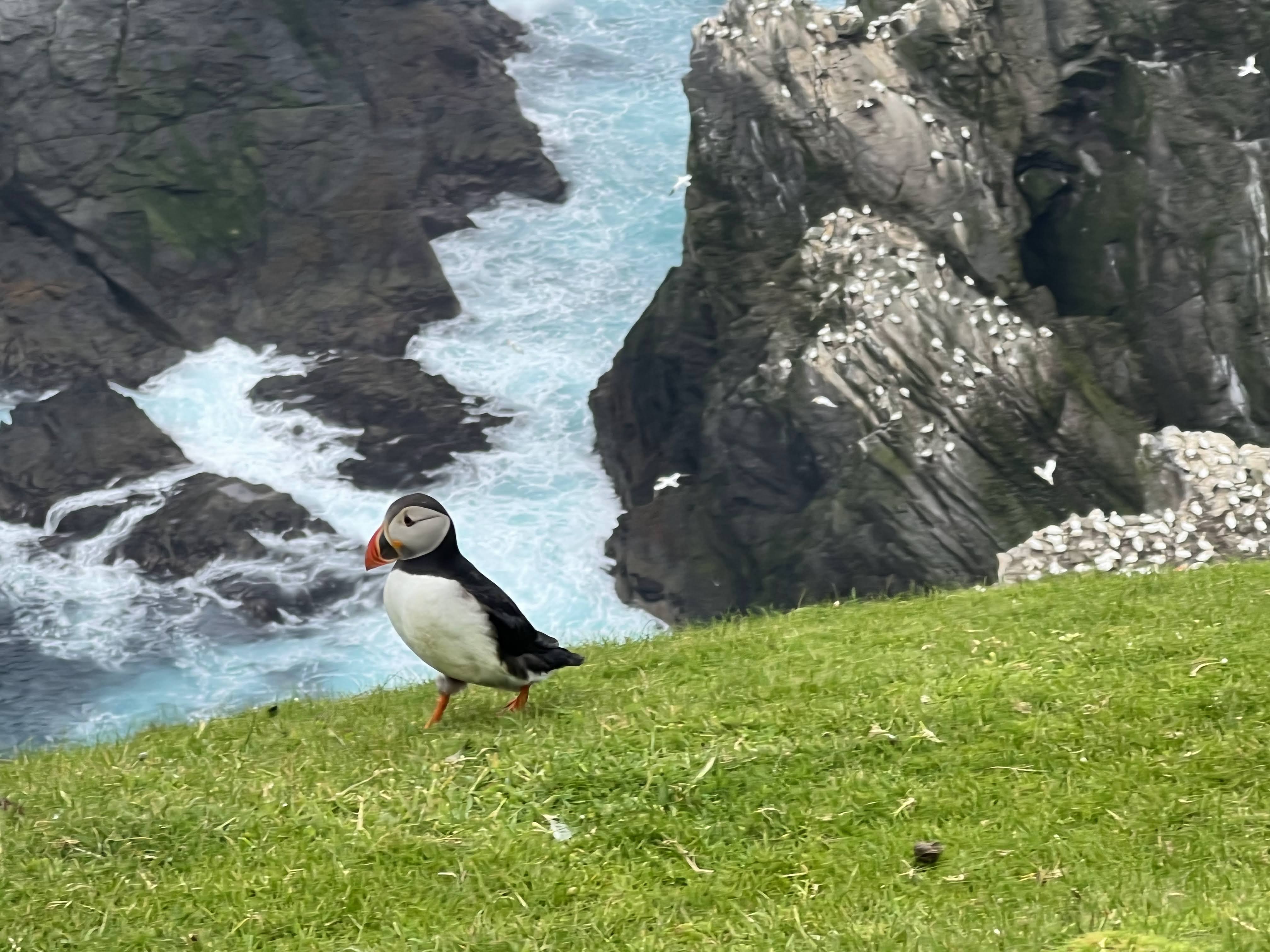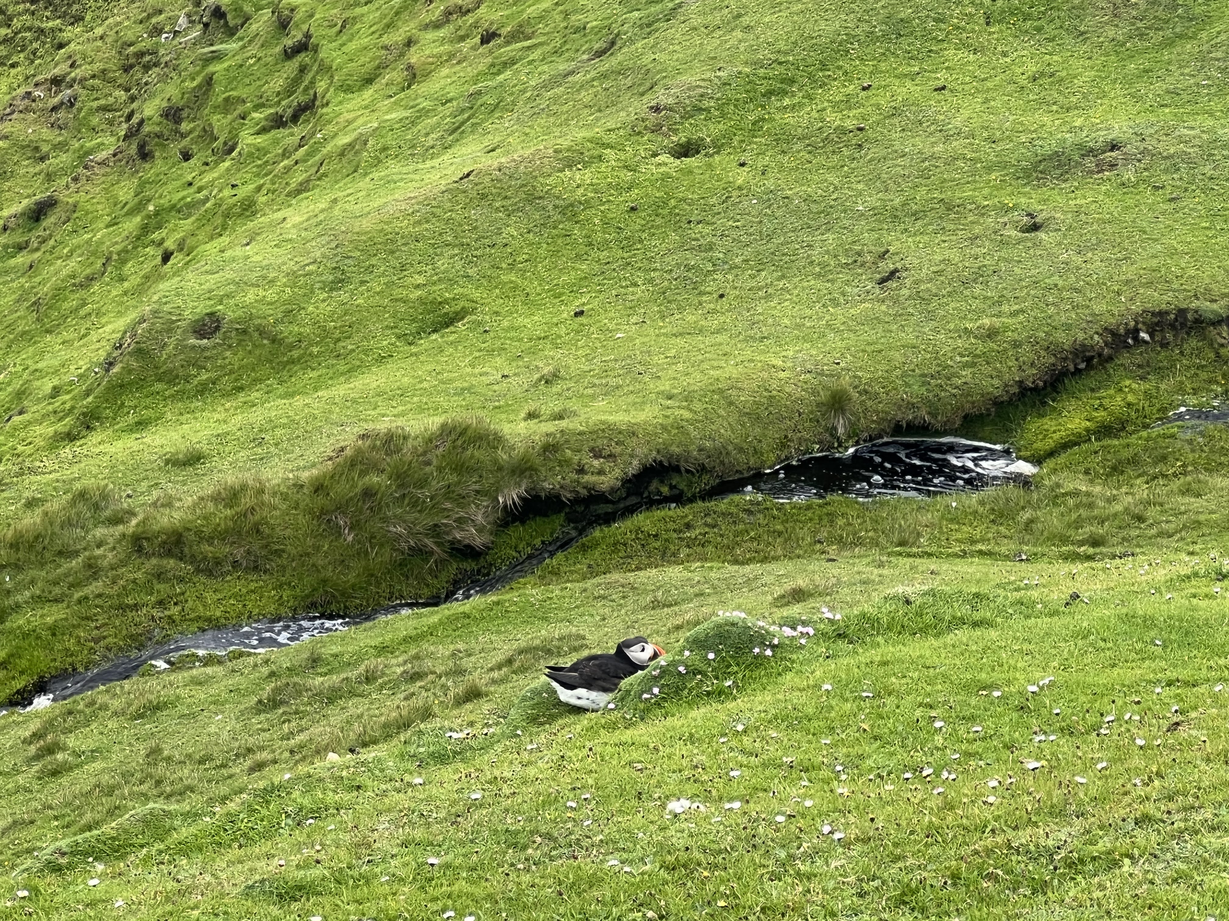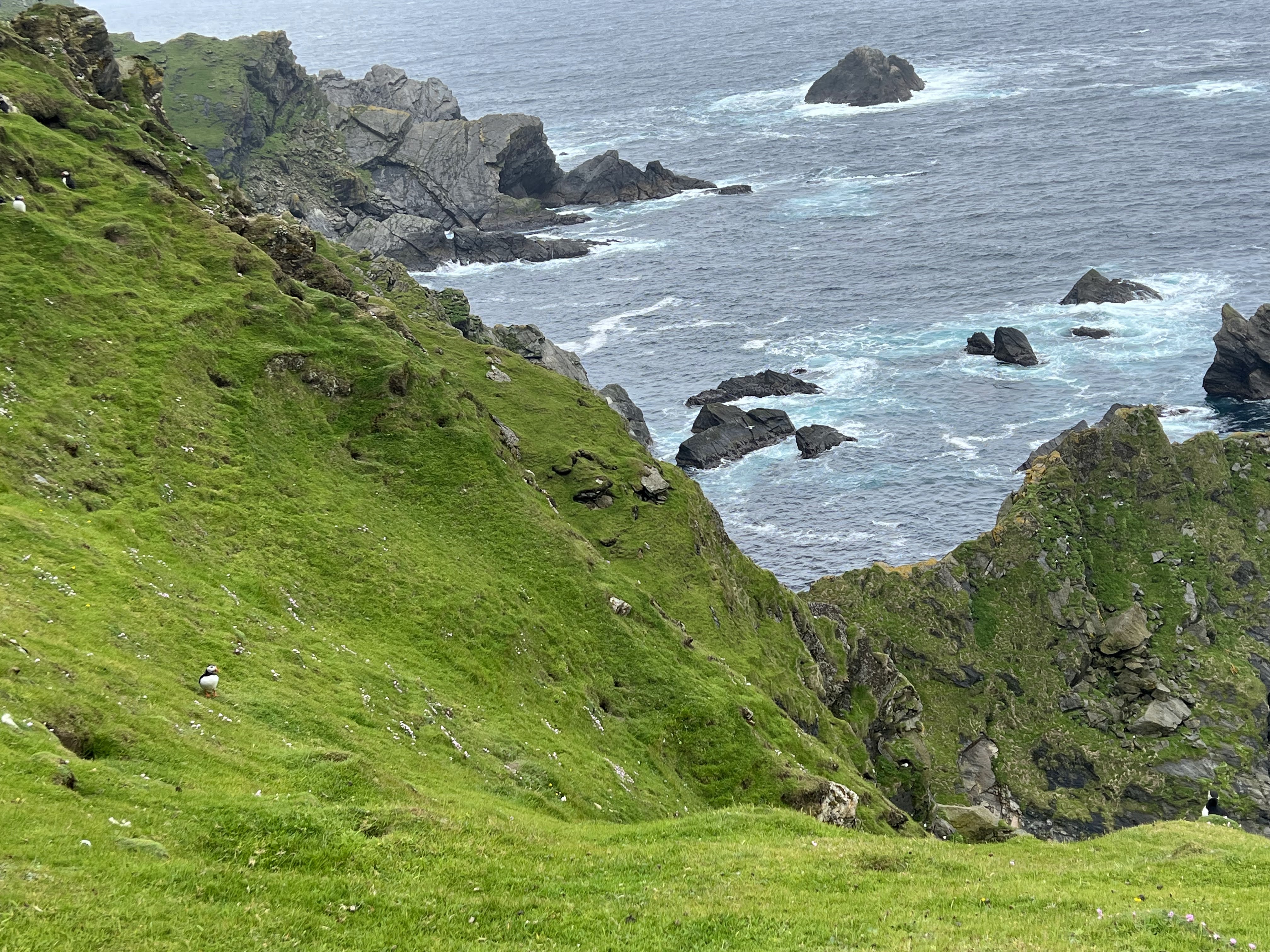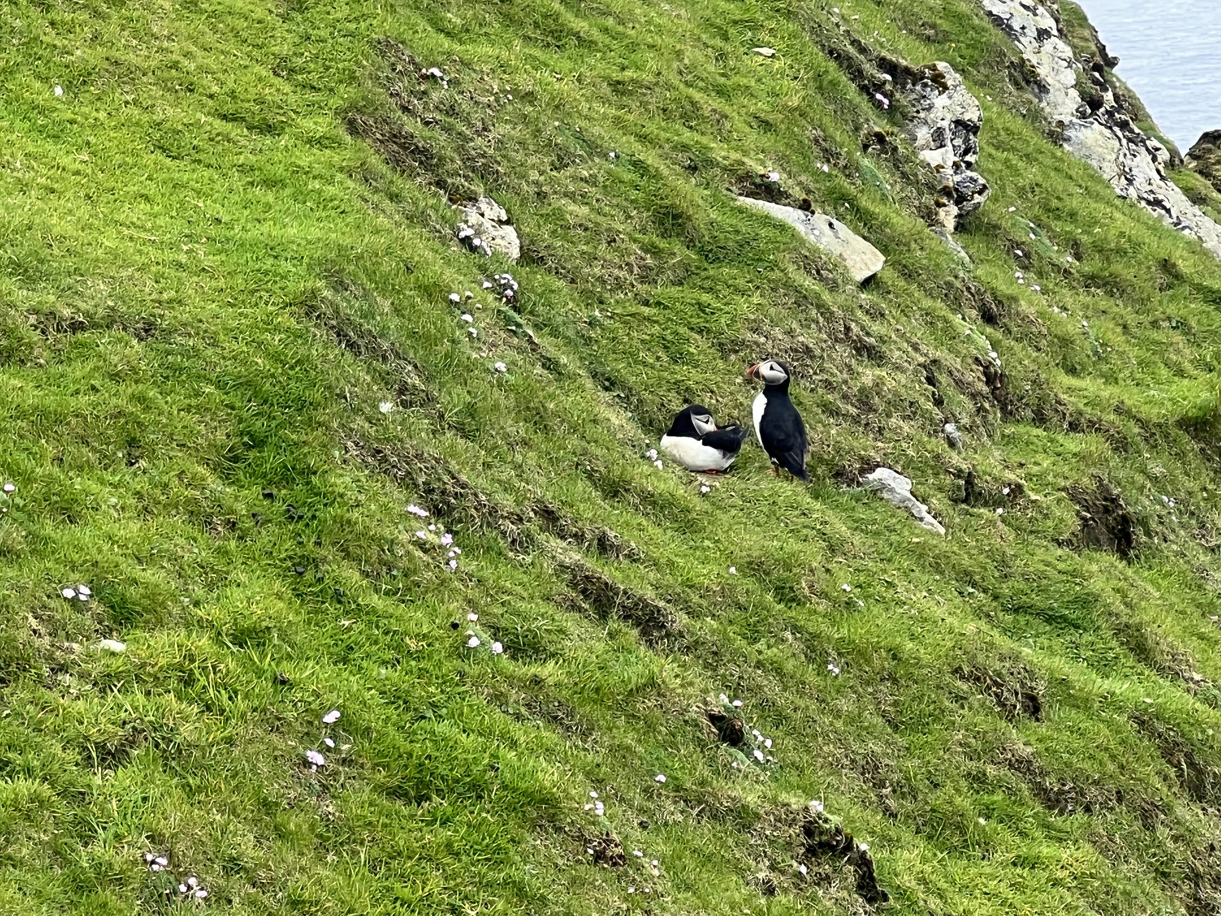 This video is mostly to show off Shetland’s northern coast.As is this photo. And my fine partner, of course.Another bustling colony, with bonus waterfall.A puffin-dotted hillside.Loved this little hunkering-down guy.A confab at the waterfall.