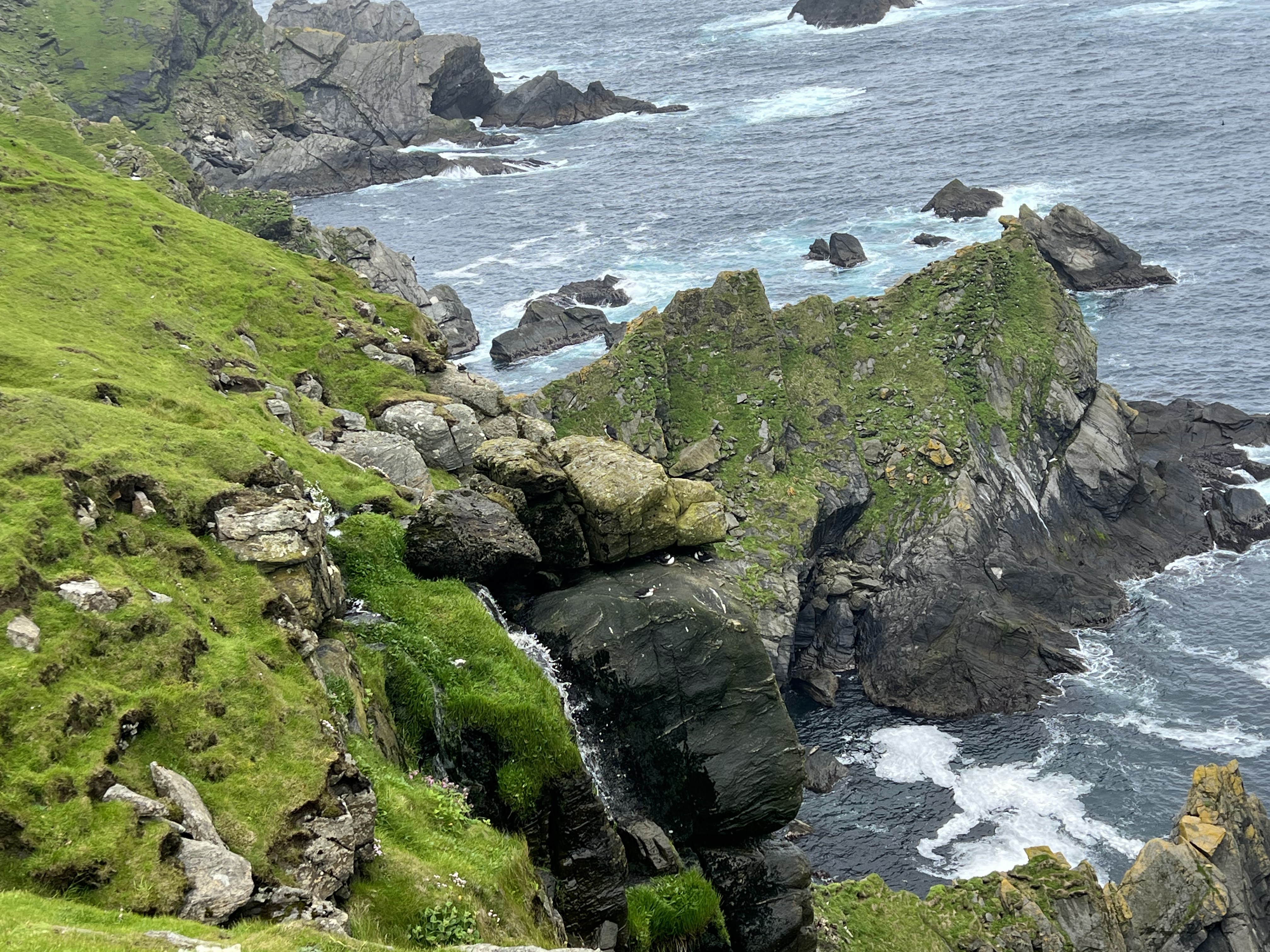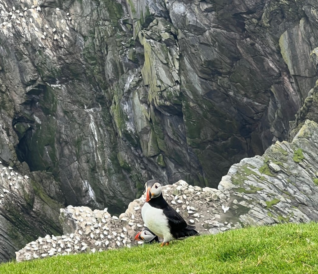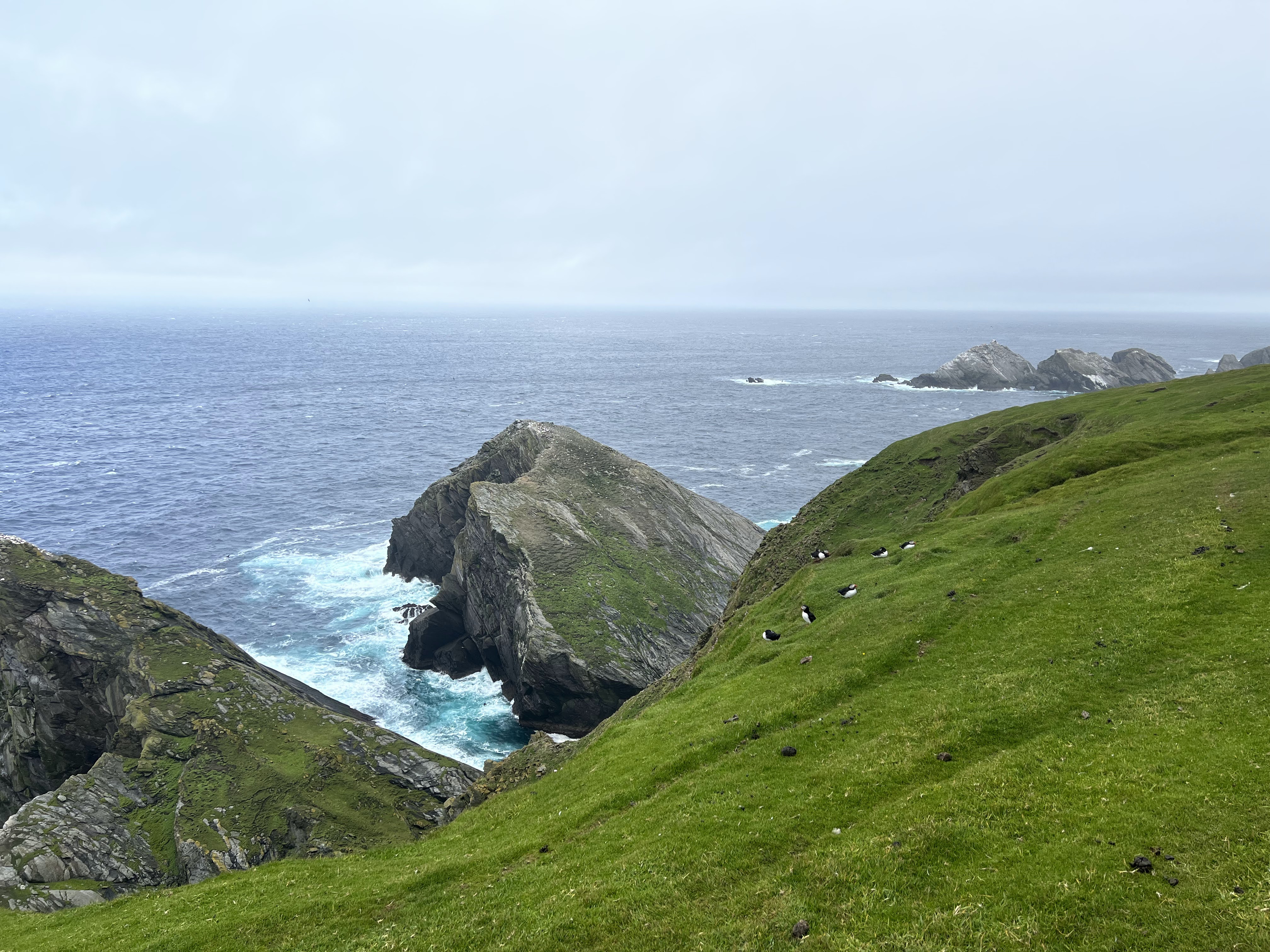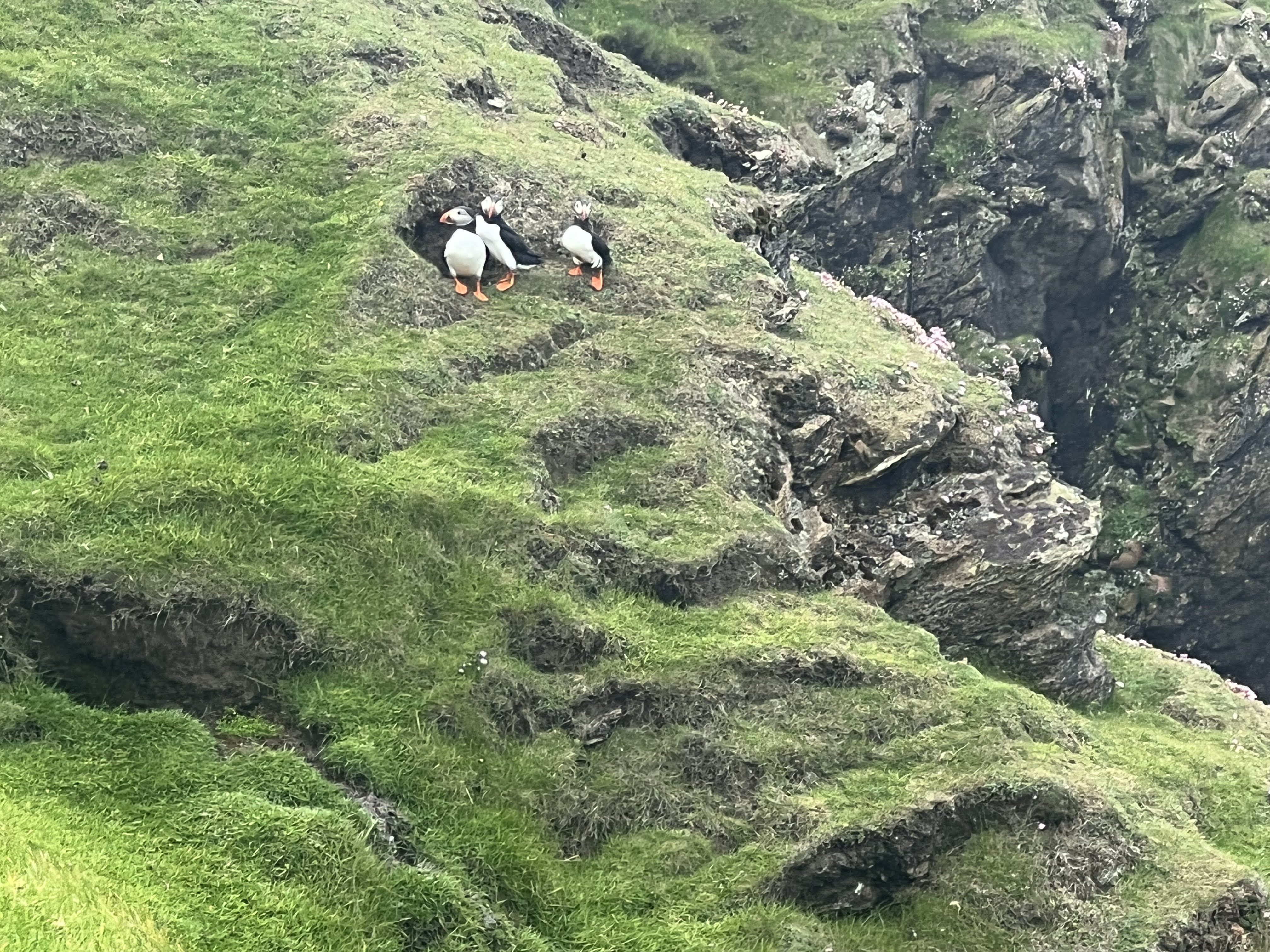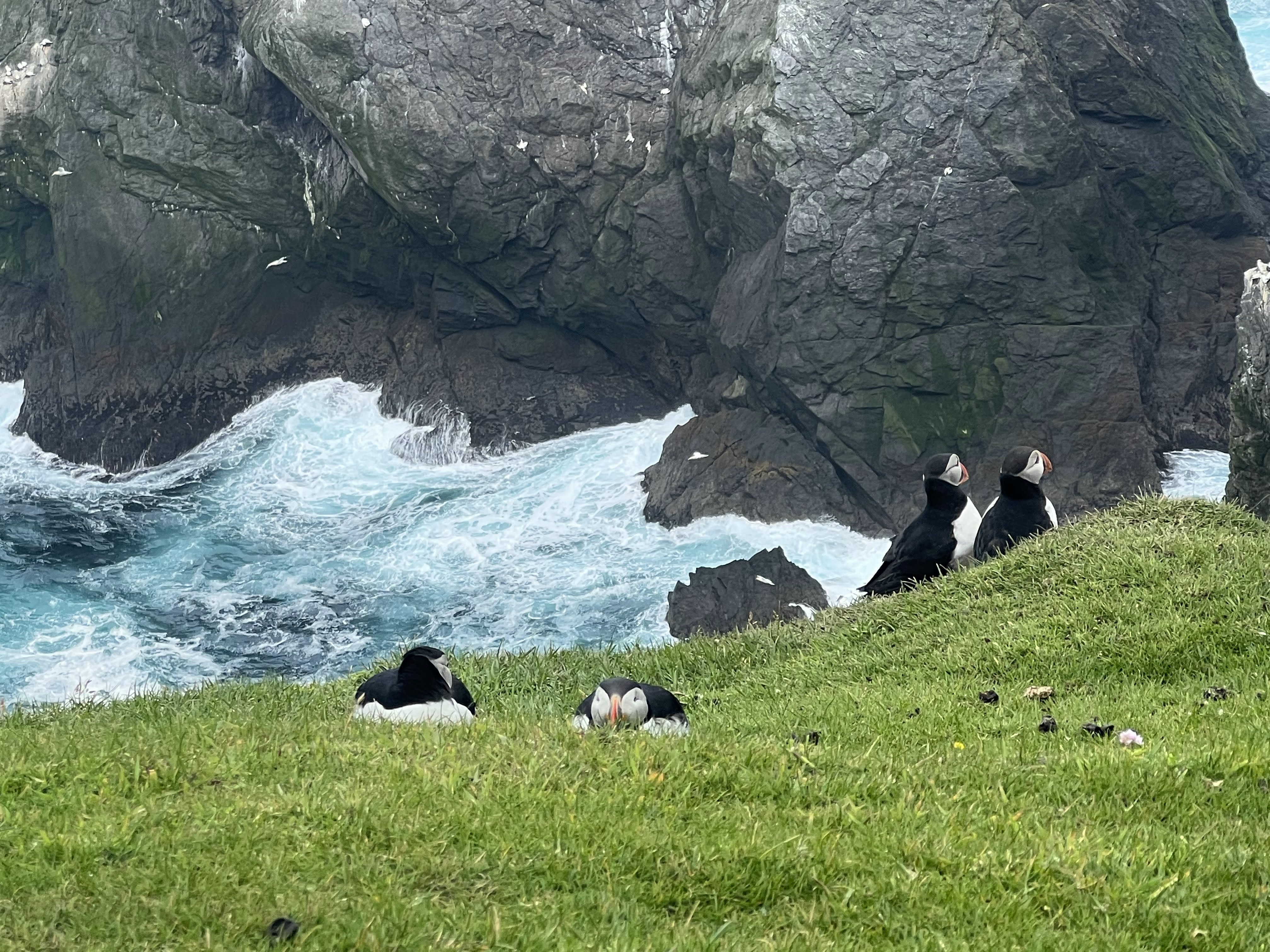 This video is mostly to show off Shetland’s northern coast.As is this photo. And my fine partner, of course.Another bustling colony, with bonus waterfall.A puffin-dotted hillside.Loved this little hunkering-down guy.A confab at the waterfall.