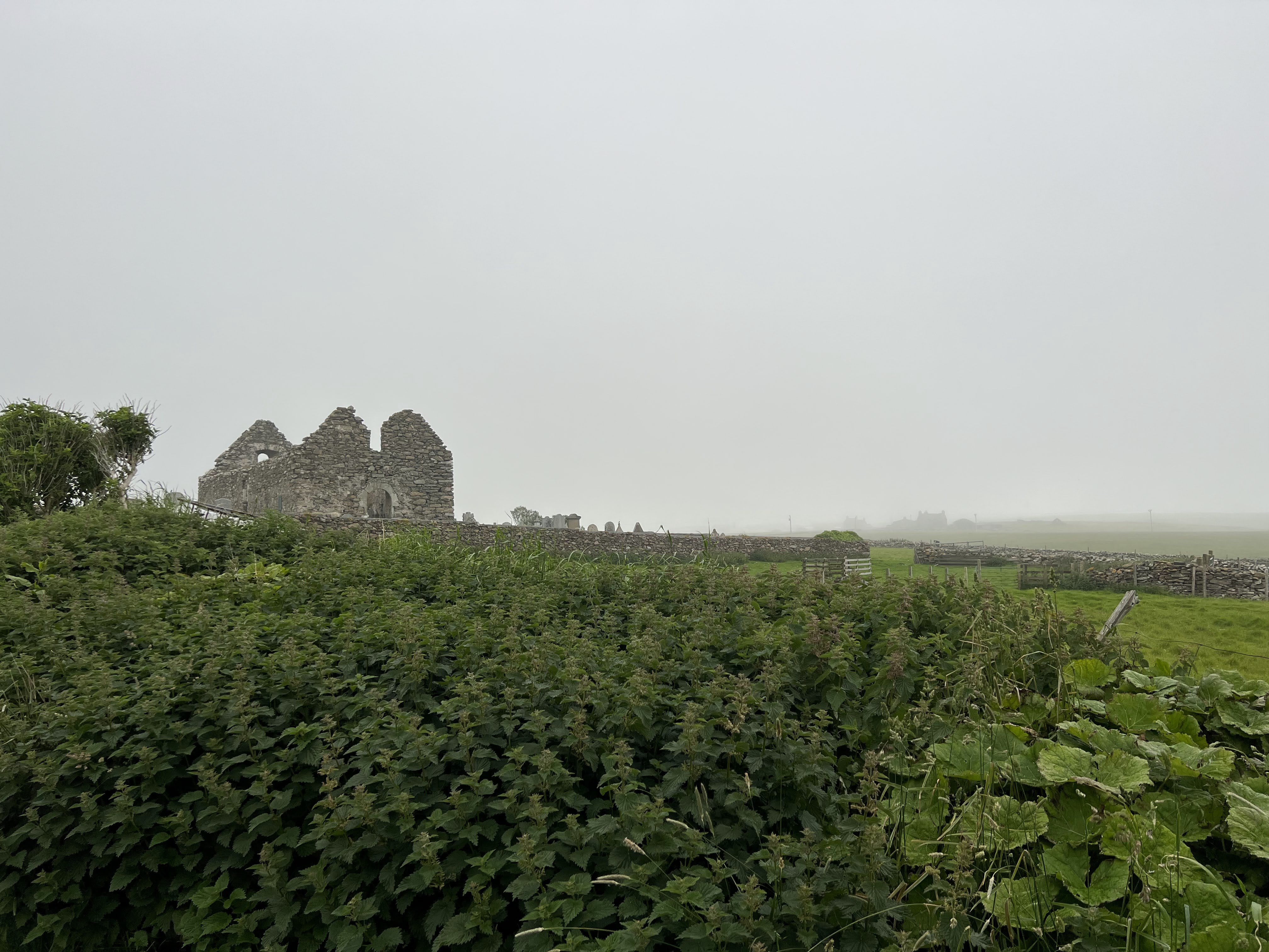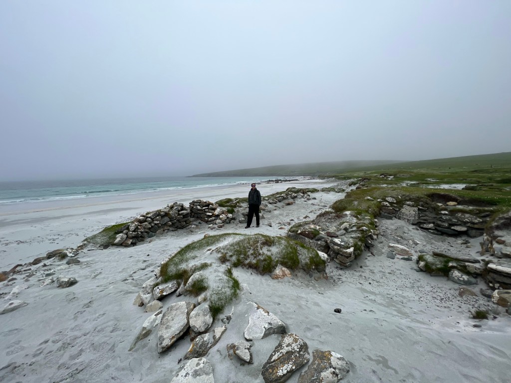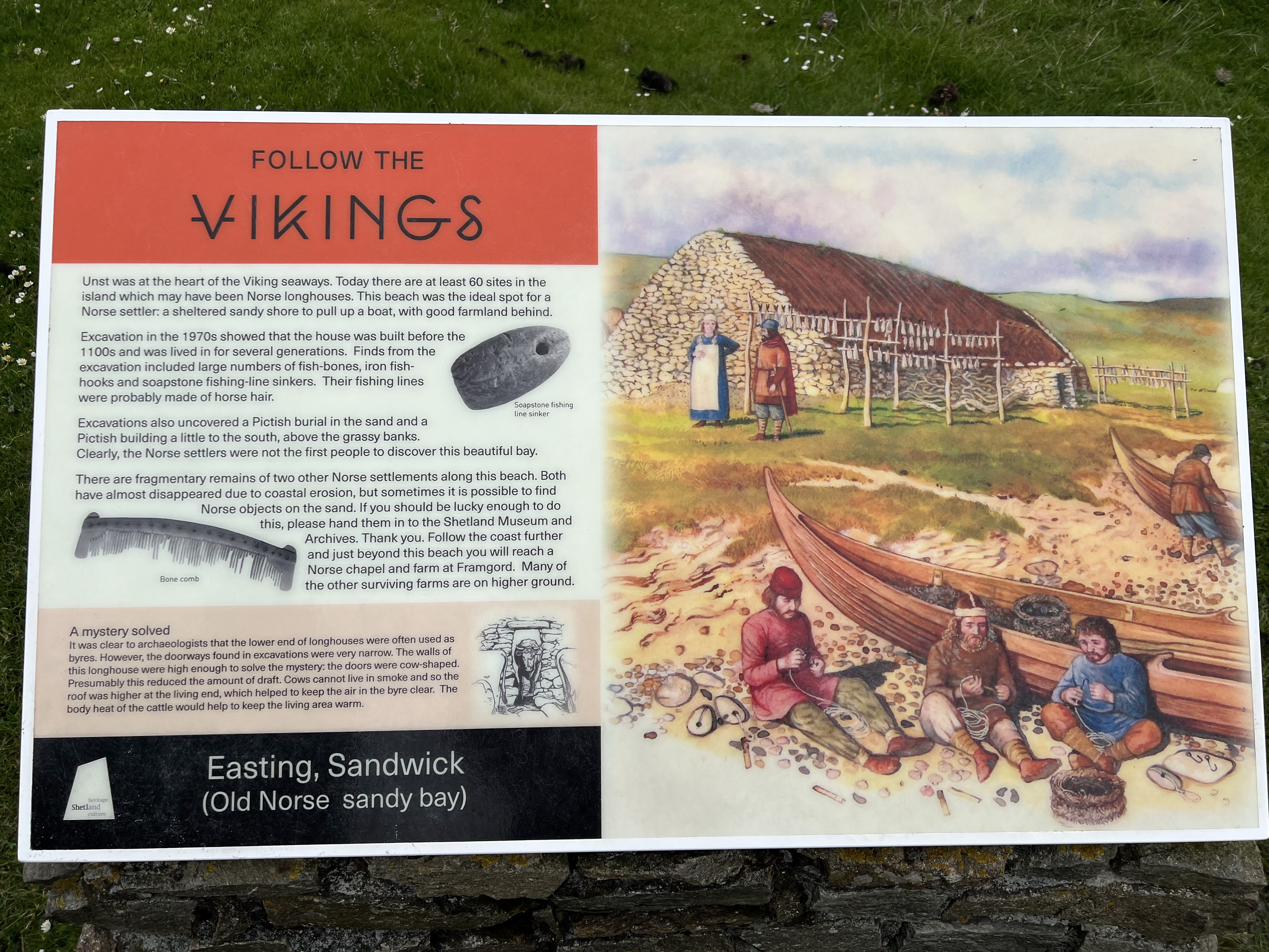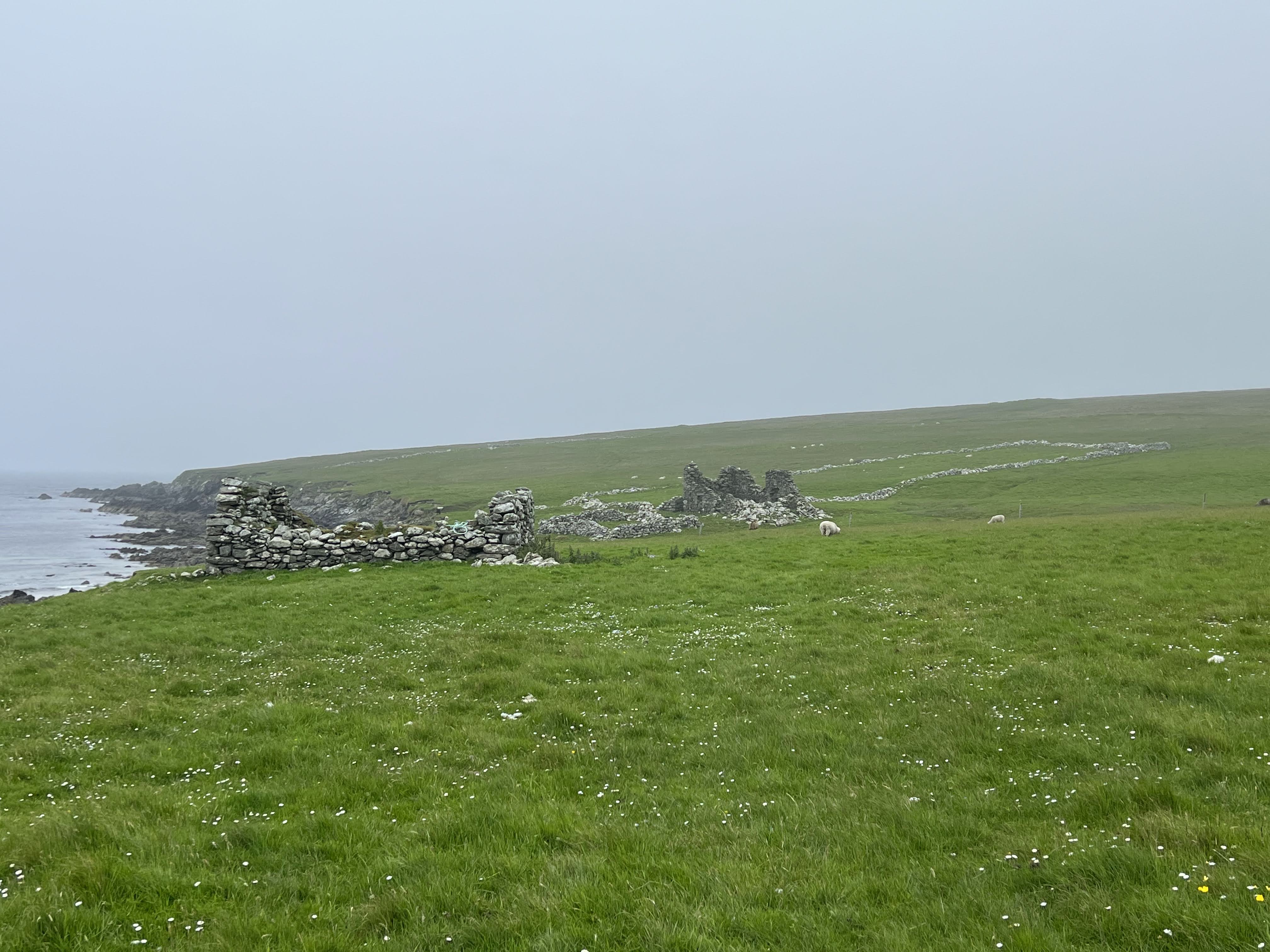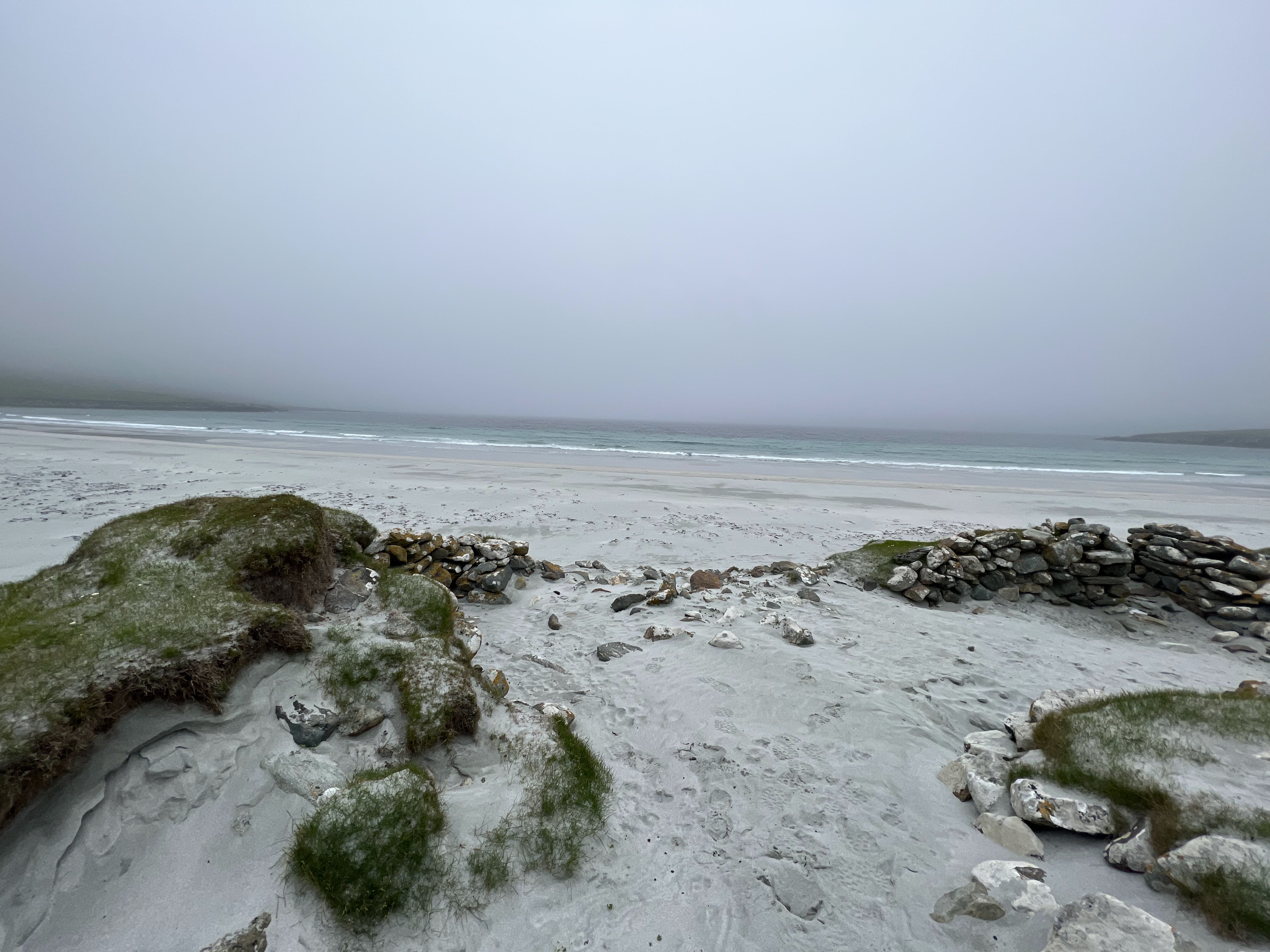 Our next stop was Sandwick Beach, and the ruins of a Norse longhouse right on the sand. A jolly walk through fields and past a ruined manse took us there.