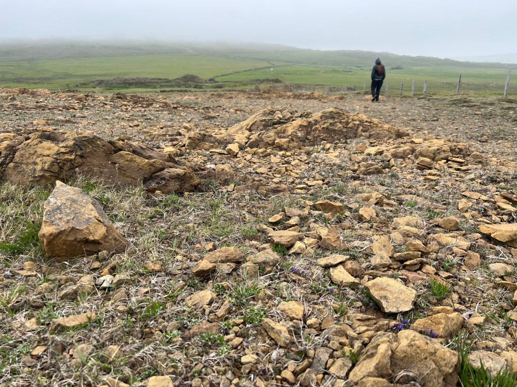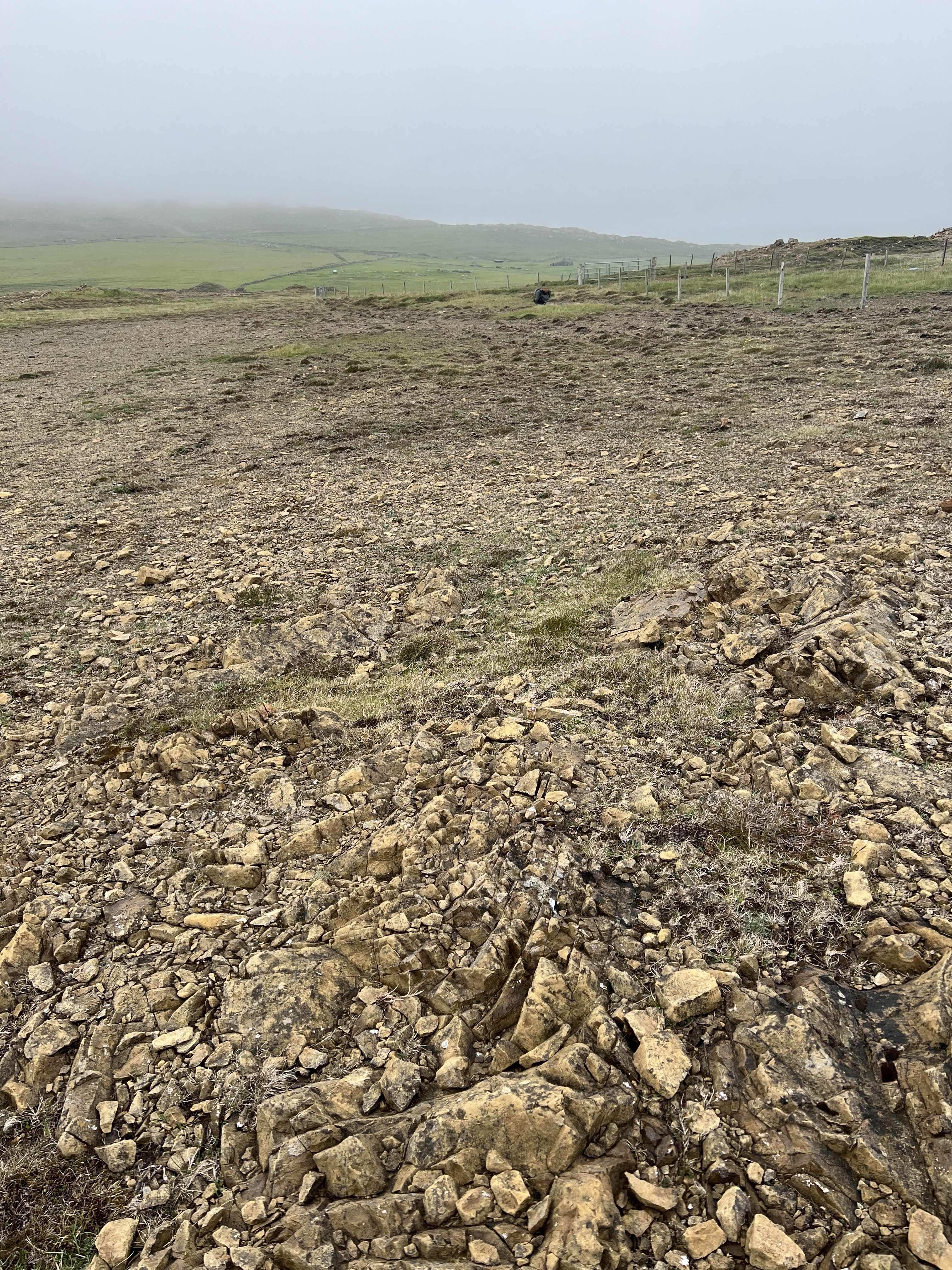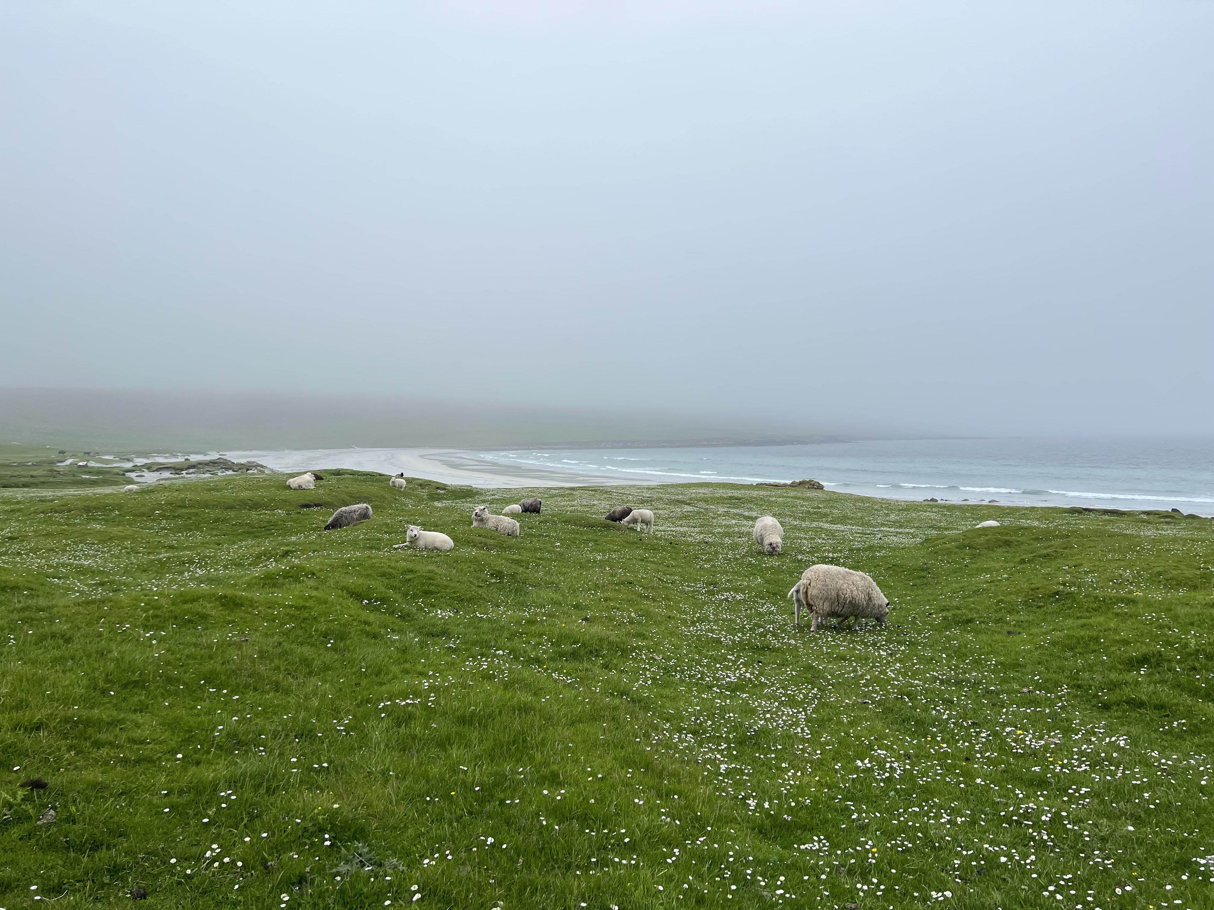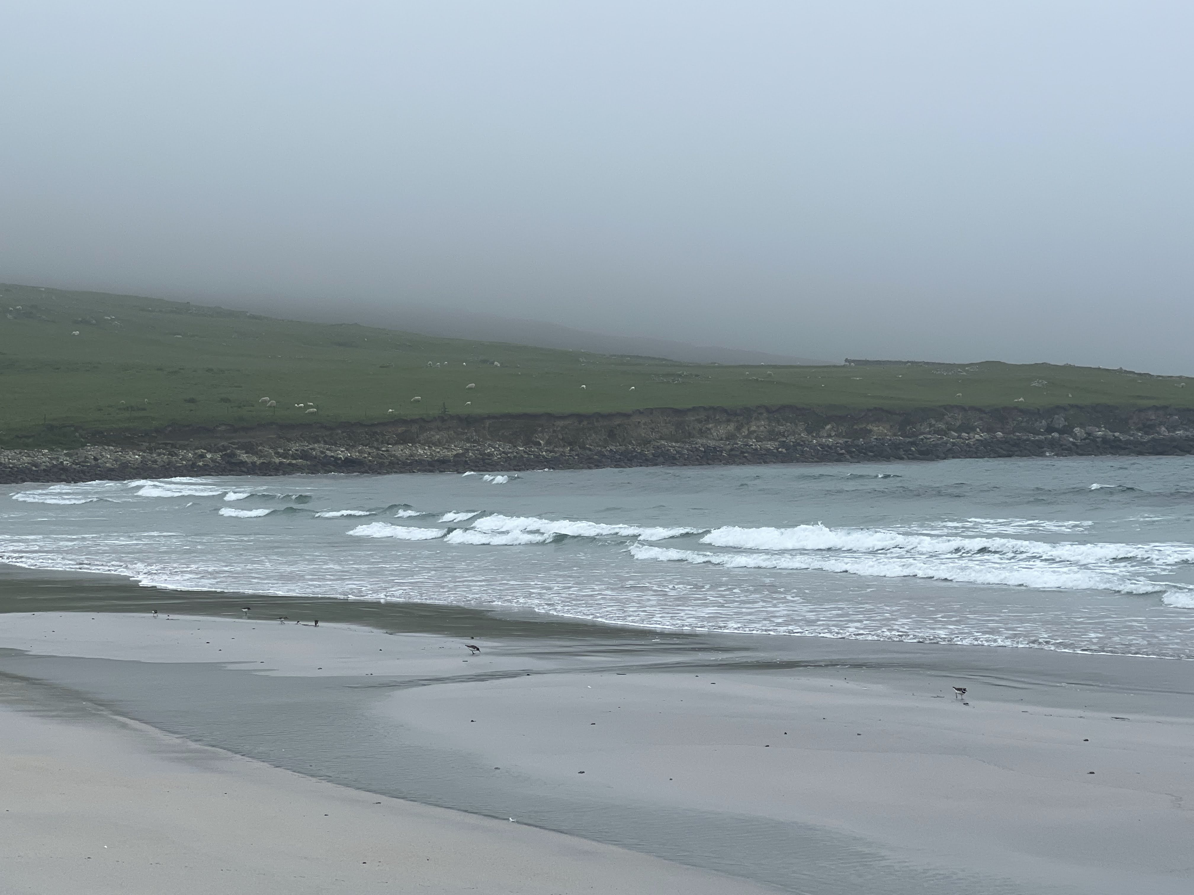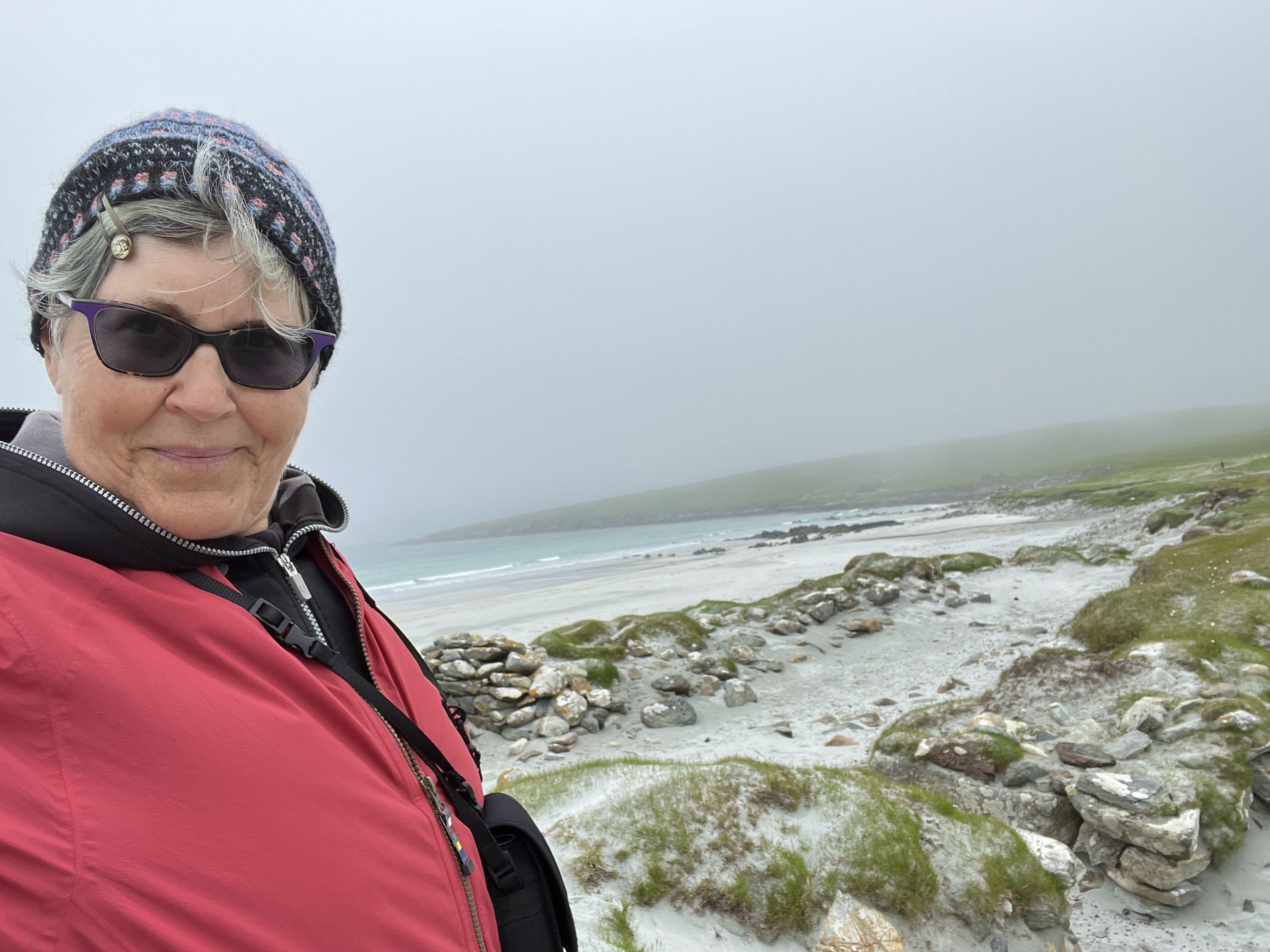 Our next stop was Sandwick Beach, and the ruins of a Norse longhouse right on the sand. A jolly walk through fields and past a ruined manse took us there.