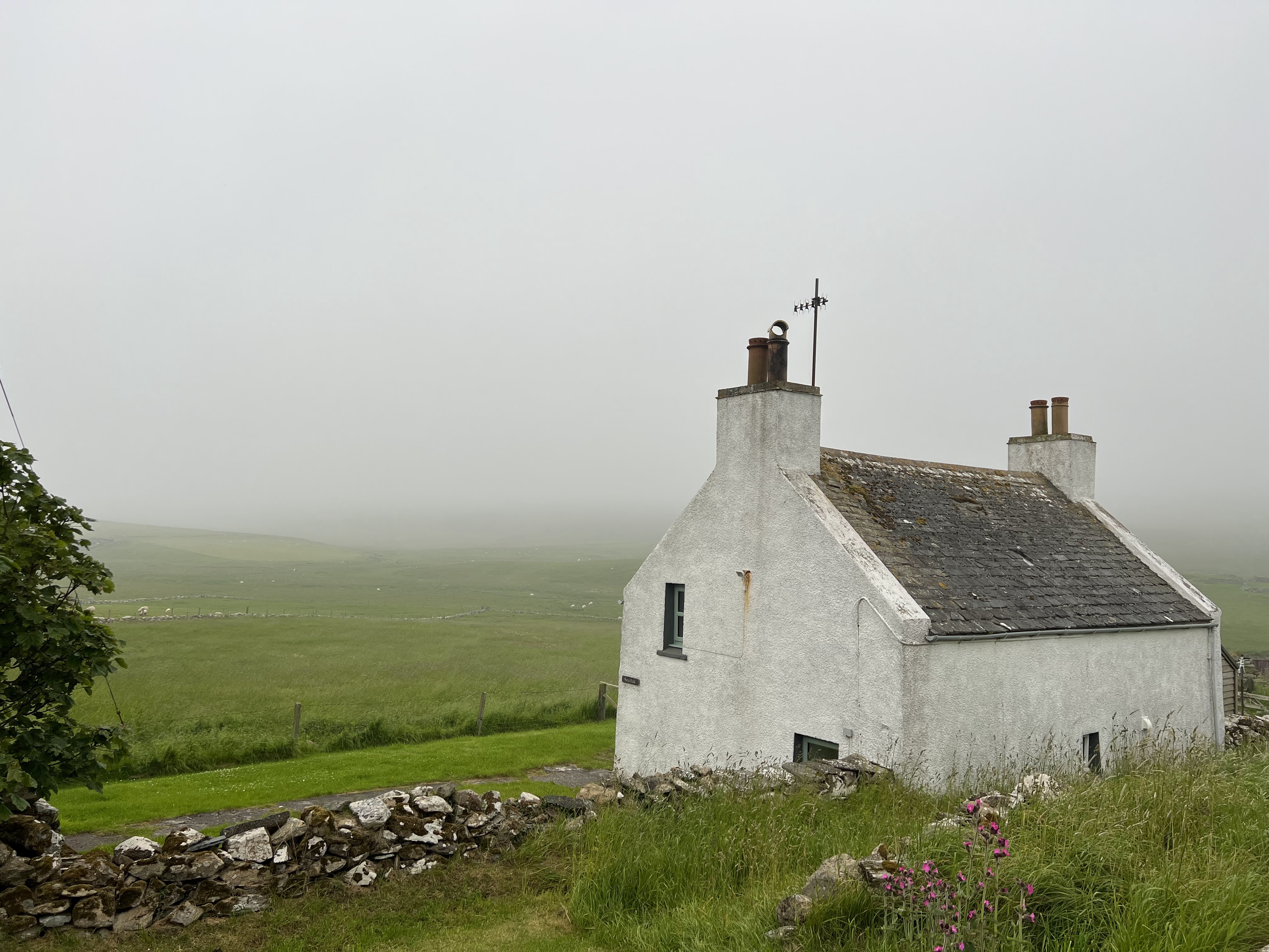 While you don’t always get the weather you want in Shetland, you get the weather you get, and it’s always beautiful. I was thrilled to have a misty, moody day to explore the serpentine fields and the ancient Norse longhouse. And then we got to go home to our lovely house and build a fire and have a meal. A perfect day.