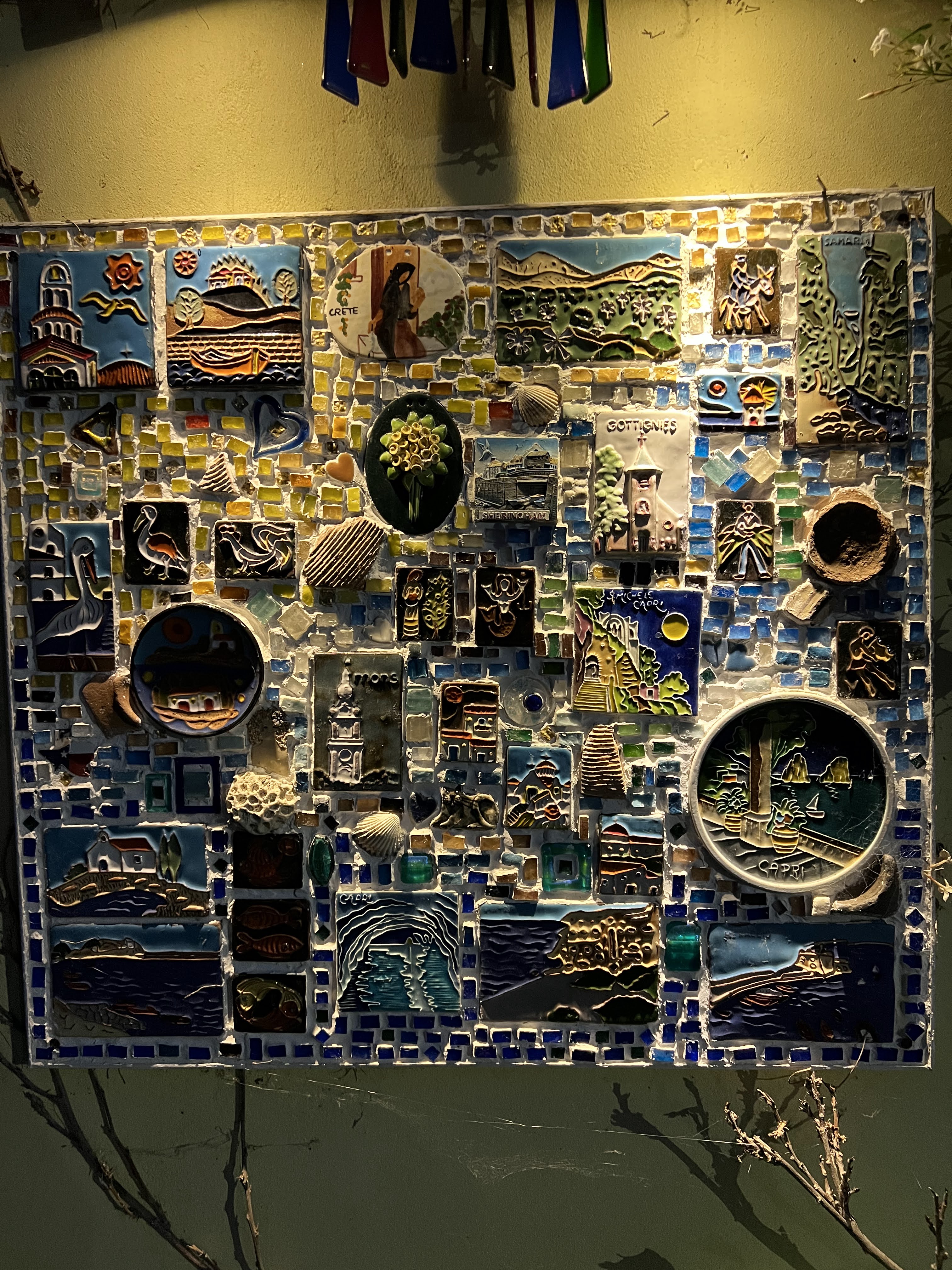 One of Christine’s mosaic creations.And two more.Home for the next few days.